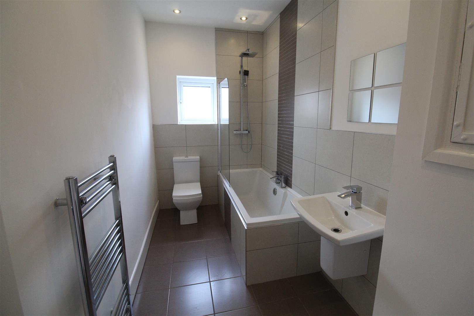 Three piece white modern suite comprising bath with fitted shower over, matching mixer tap and folding glass screen, wash hand basin and low-level WC, tiled surround, full height tiling to two walls, heated towel rail, uPVC frosted double glazed window to rear, ceramic tiled flooring.