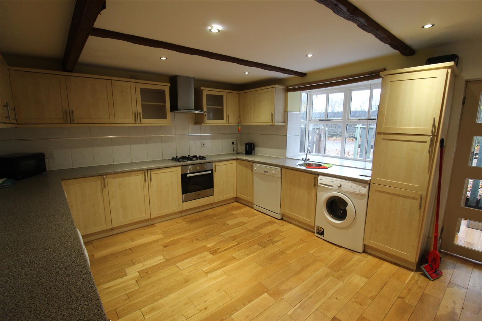 Fitted with a matching range of base units with contrasting round edged worktops, stainless steel sink unit with mixer tap, plumbing for washing machine and dishwasher, space for fridge and freezer, built-in electric fan assisted oven, four ring gas hob with extractor hood over, sealed unit double glazed box window to front, double radiator, oak flooring, door to: