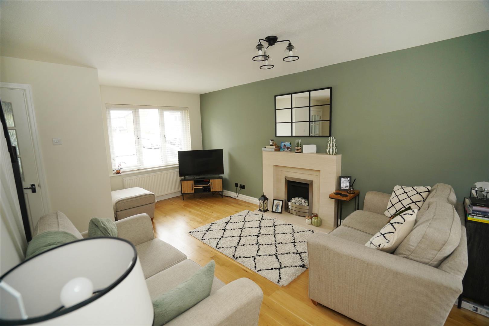 UPVC double glazed window to front, living flame effect gas fire with feature surround, built-in under-stairs storage cupboard with additional shelving and space for freezer, two radiators, oak flooring, stairs, uPVC double glazed french doors to garden, door to: