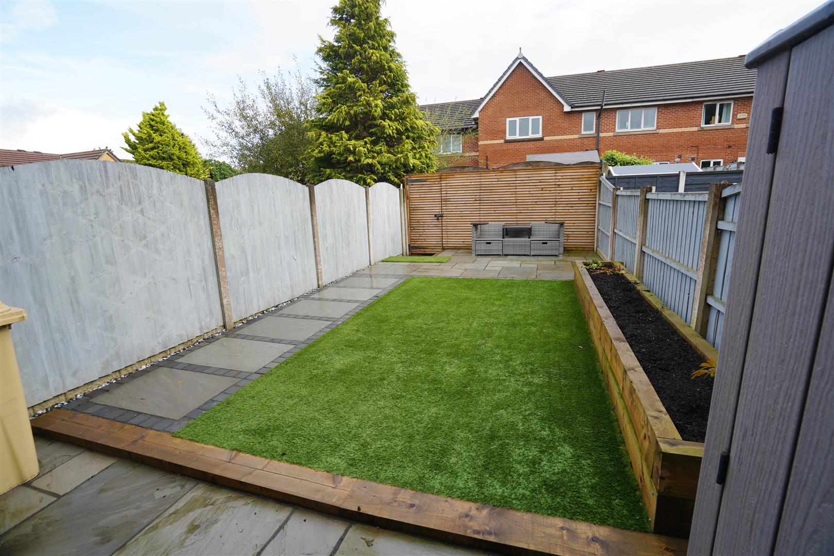 Private landscaped rear garden with artificial lawned area and mature shrub borders, large paved sun patio, timber fencing to rear and sides, paved pathway, rea gated access.