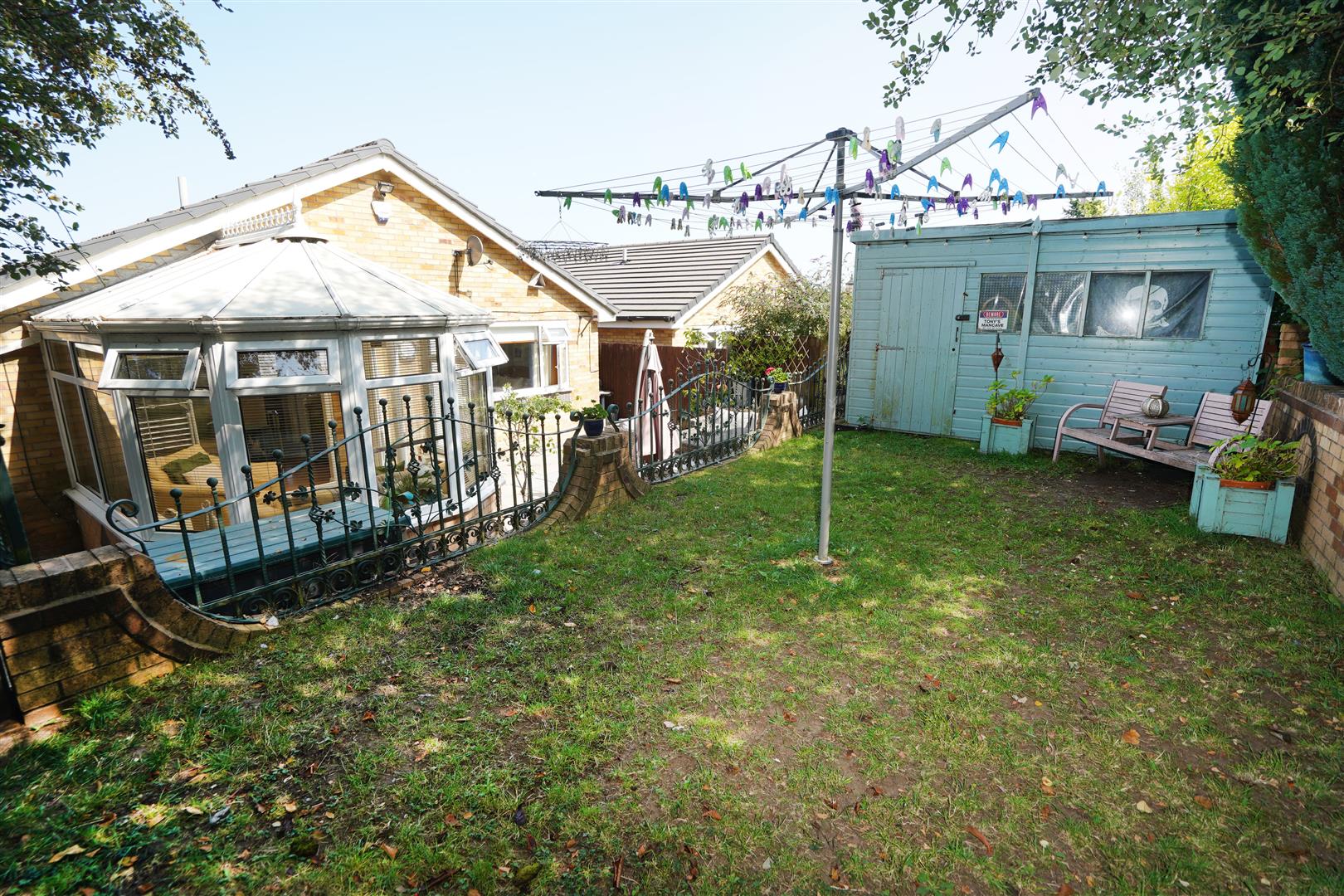 Front garden with lawned area and paved pathway leads round both sides, steps leading to front entrance door, outside cold water tap and power point. Private rear garden, enclosed by timber fencing to rear and sides, large paved sun patio with steps up to lawned area and raised flower and shrub borders, timber garden shed, power socket.