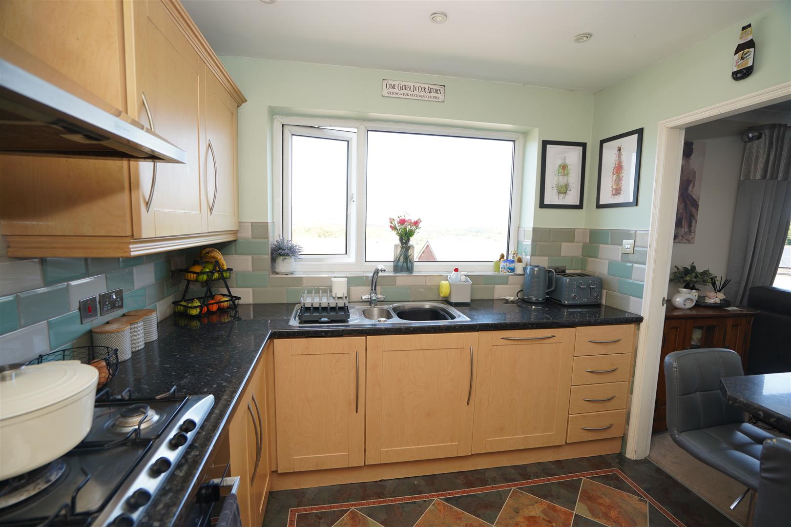 Fitted with a matching range of beech effect base and eye level units with drawers, cornice trims and contrasting round edged worktops, breakfast bar, 1+1/2 bowl stainless steel sink unit with single drainer and mixer tap with tiled splashbacks, integrated fridge, freezer and dishwasher, built-in fan assisted double oven, gas hob with extractor hood over, uPVC double glazed window to front with panoramic views of open countryside, radiator, wall mounted concealed gas boiler serving heating system and domestic hot water.
