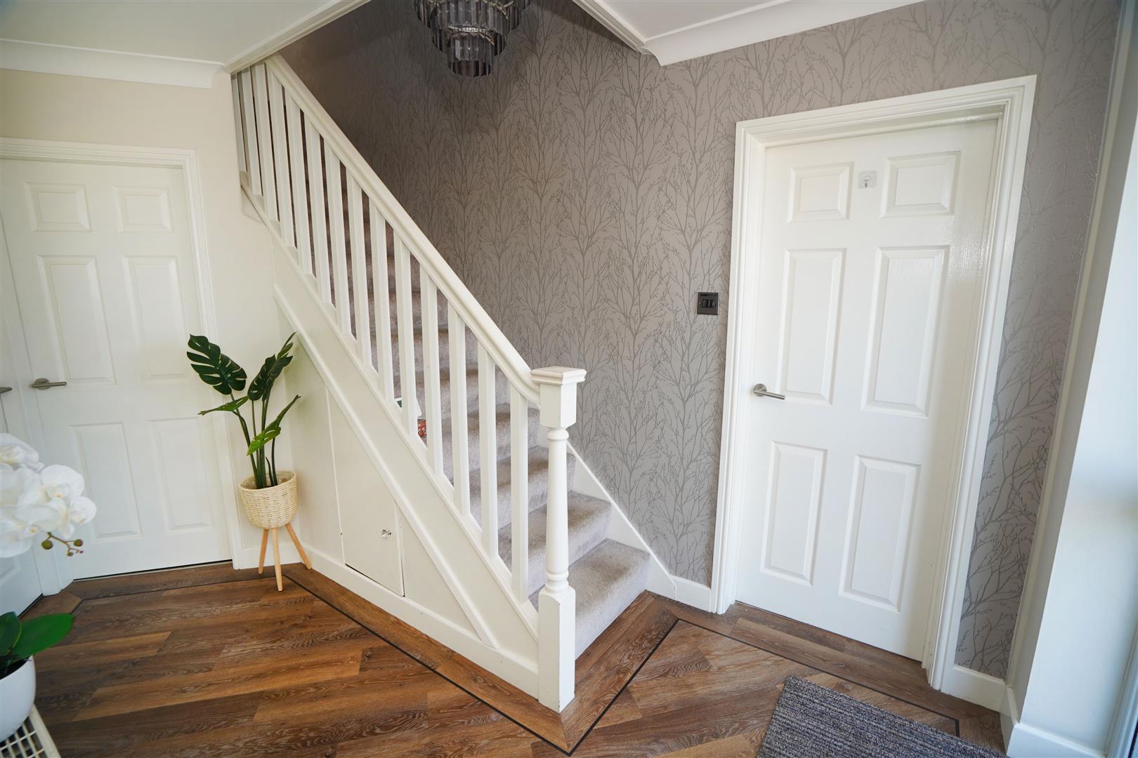 UPVC frosted double glazed window to front, built-in under-stairs storage cupboard, radiator, karndean flooring, stairs, door to: