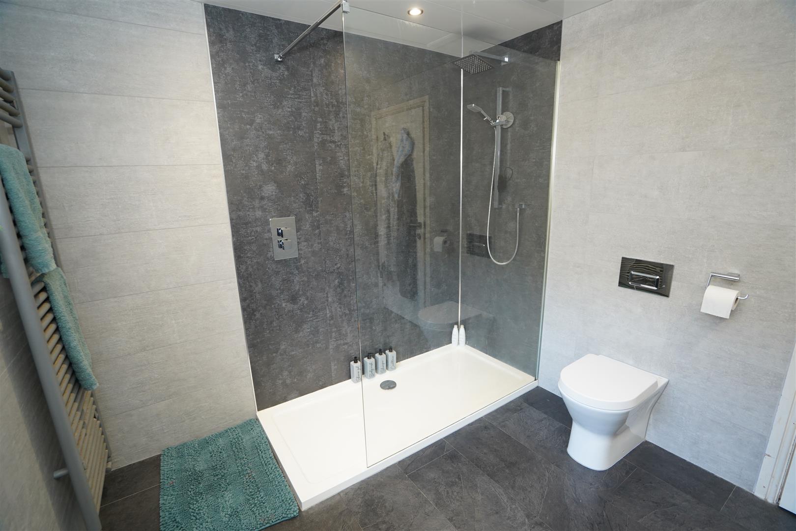Recently refitted with three piece modern white suite comprising double shower enclosure with rainfall and hand held shower over with glass screen, wash hand basin in vanity unit with cupboards and drawer under, mixer tap and ceramic tiling to all walls, heated towel rail, back lit and heated wall mounted mirror, wall mounted storage cabinets, uPVC frosted double glazed window to side, karndean flooring.