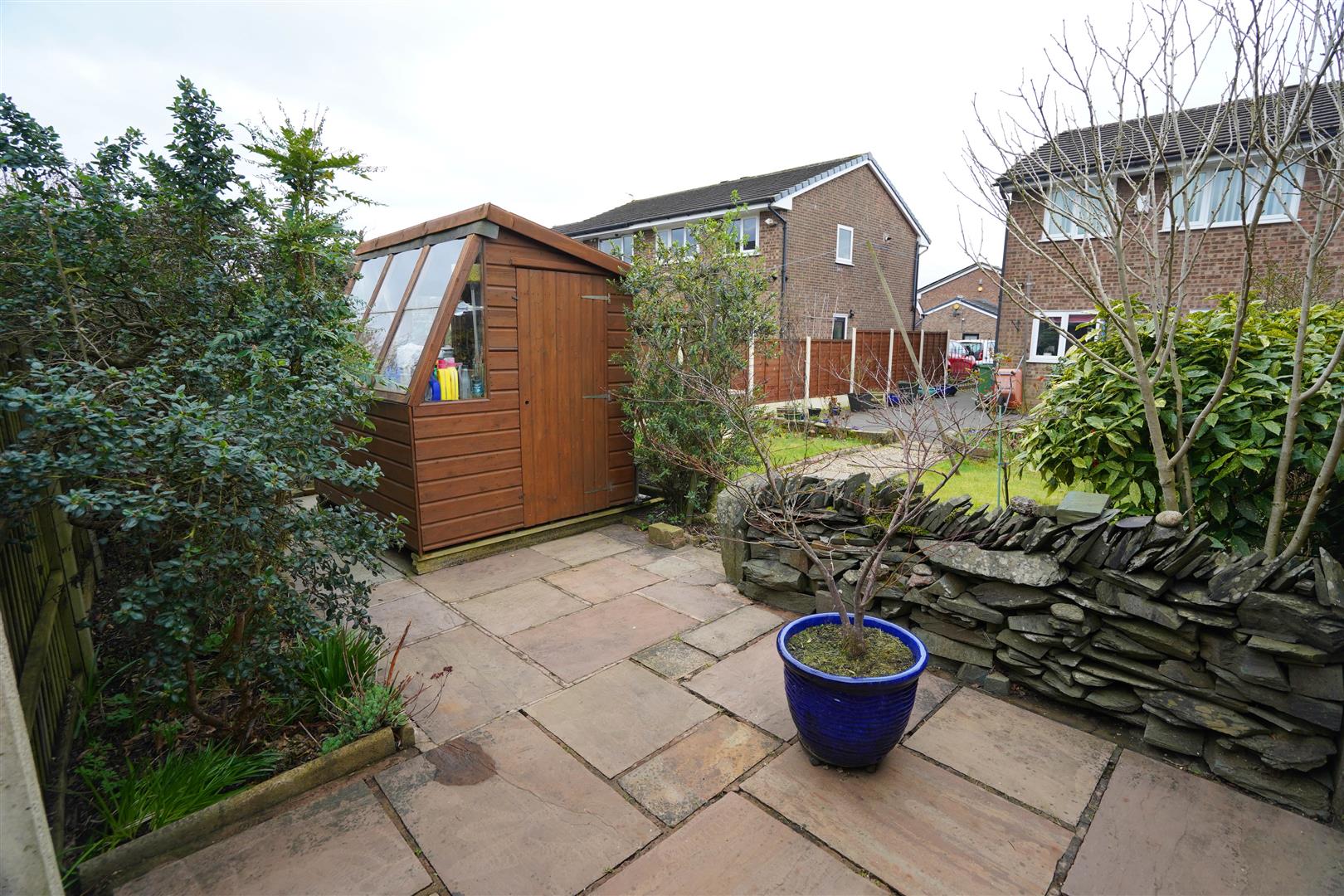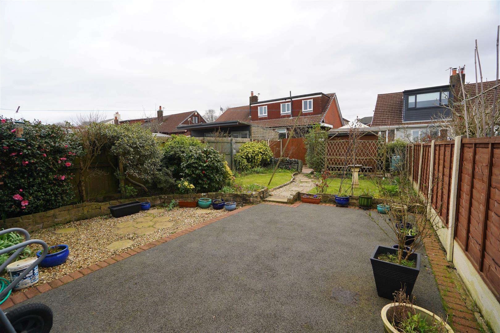 Rear garden, enclosed by timber fencing to rear and sides, gravelled and paved pathway leading to a paved sun patio, lawned area and mature flower and shrub borders, timber garden shed, side gated access.