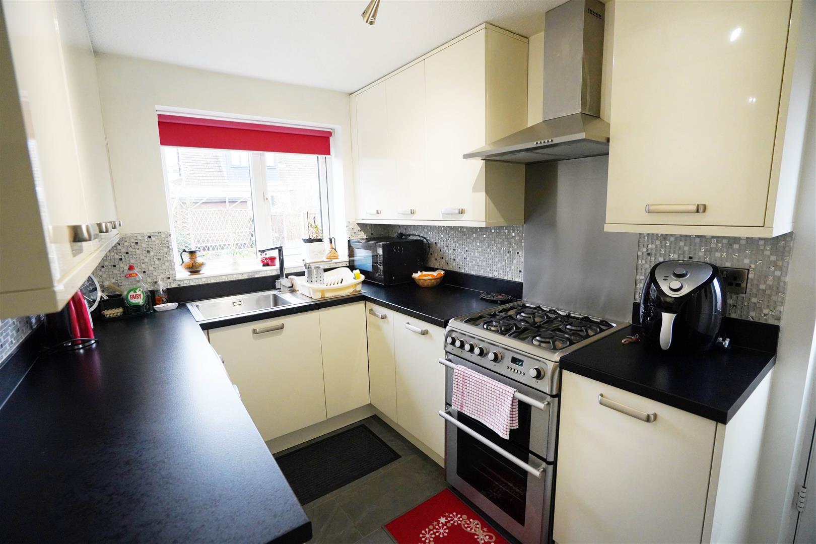 Fitted with a matching range of modern cream base and eye level units with under cupboard lighting, contrasting round edged worktops, stainless steel sink unit with single drainer and mixer tap with tiled splashbacks, plumbing for washing machine, space for fridge/freezer, gas point for cooker with extractor hood over, uPVC double glazed window to rear, ceramic tiled flooring, Composite double glazed side door to garden, door to built-in storage cupboard.