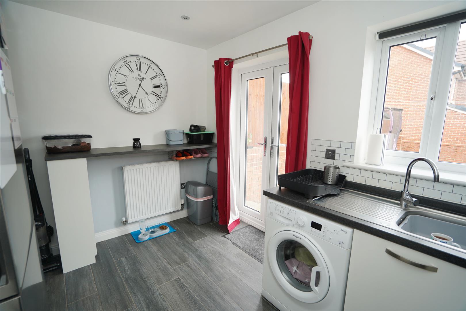 Fitted with a matching range of modern white base and eye level units with contrasting round edged worktops, stainless steel sink unit with single drainer and mixer tap, plumbing for, space for fridge/freezer, built-in electric fan assisted double oven, four ring gas hob with extractor hood over, uPVC double glazed window to rear, radiator, wall mounted concealed gas combination boiler serving heating system and domestic hot water, double door.