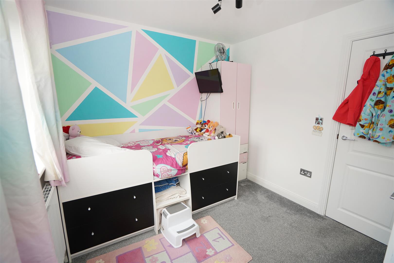 UPVC double glazed window to front, built-in triple wardrobe(s) with hanging rails and shelving, built-in over-stairs storage cupboard, radiator, door to: