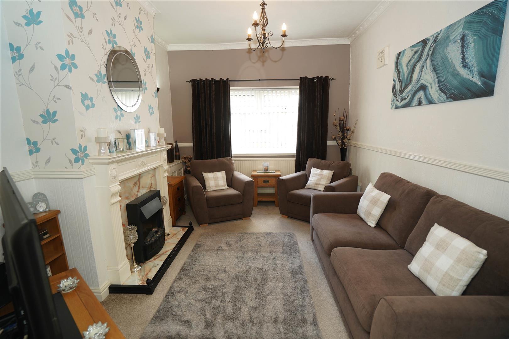 UPVC double glazed window to front, decorative living flame effect electric fire set in feature Adam style surround and marble effect inset and hearth, radiator, dado rail, two wall lights, coving to ceiling.