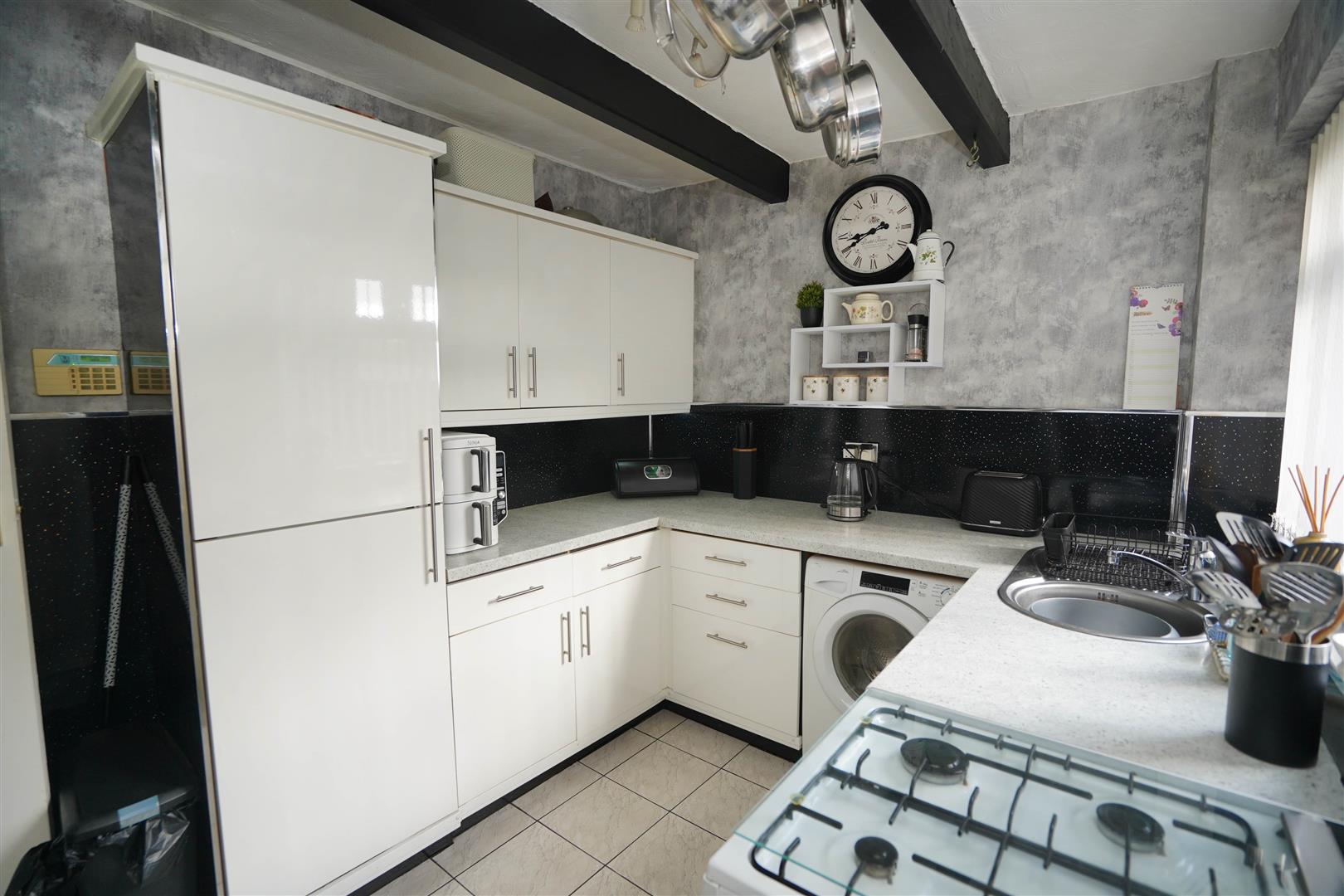 Fitted with a matching range of white base and eye level units with underlighting, drawers and cornice trims, stainless steel sink with single drainer and mixer tap, plumbing for, vent for tumble dryer, space for fridge/freezer, gas point for cooker, uPVC double glazed window to side, radiator, double glazed door to rear, door to: