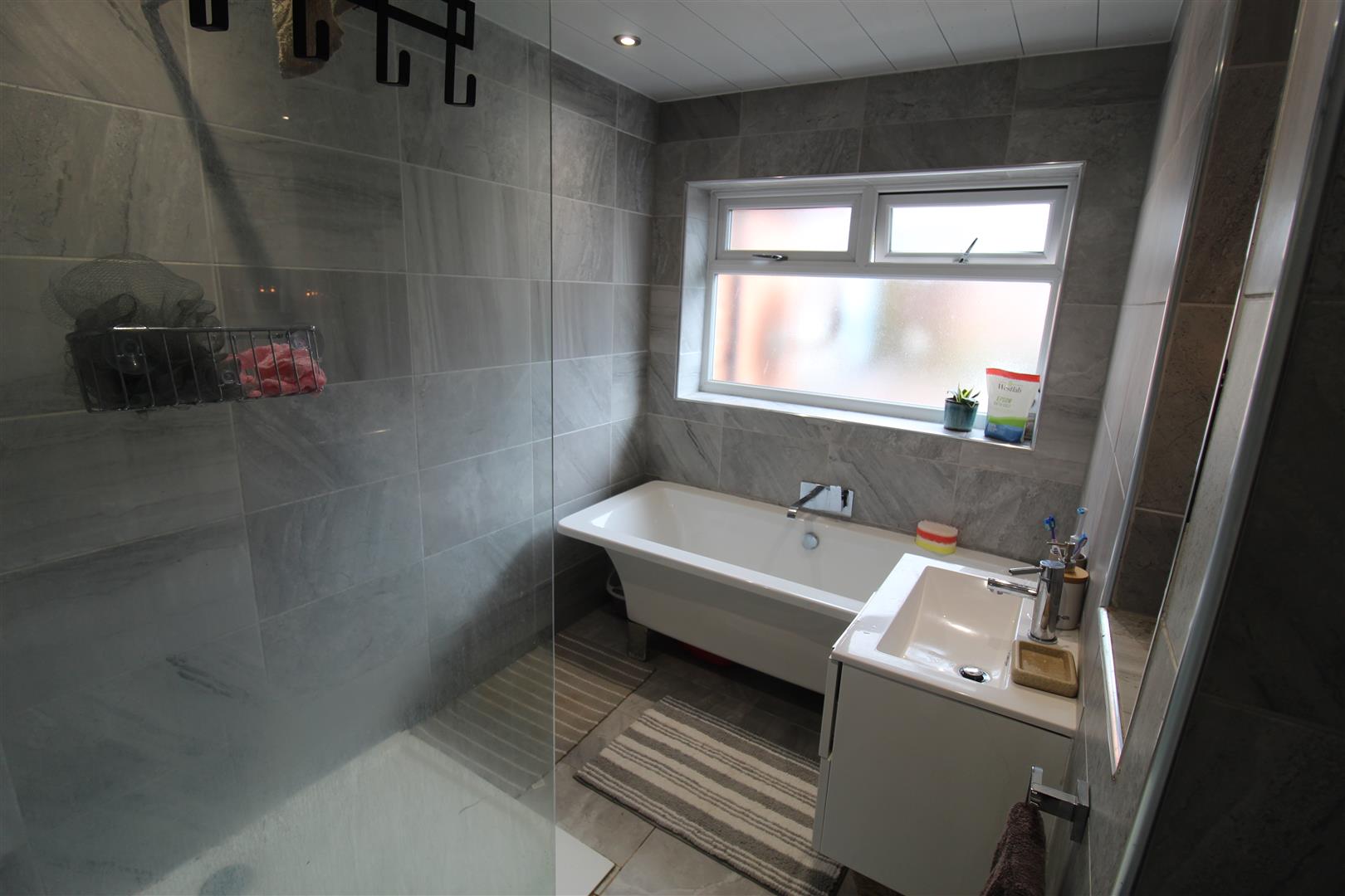Fitted with three piece suite comprising deep panelled bath and wash hand basin with under, drawers, mixer tap and full height ceramic tiling to all walls, uPVC frosted double glazed window to rear, heated towel rail.