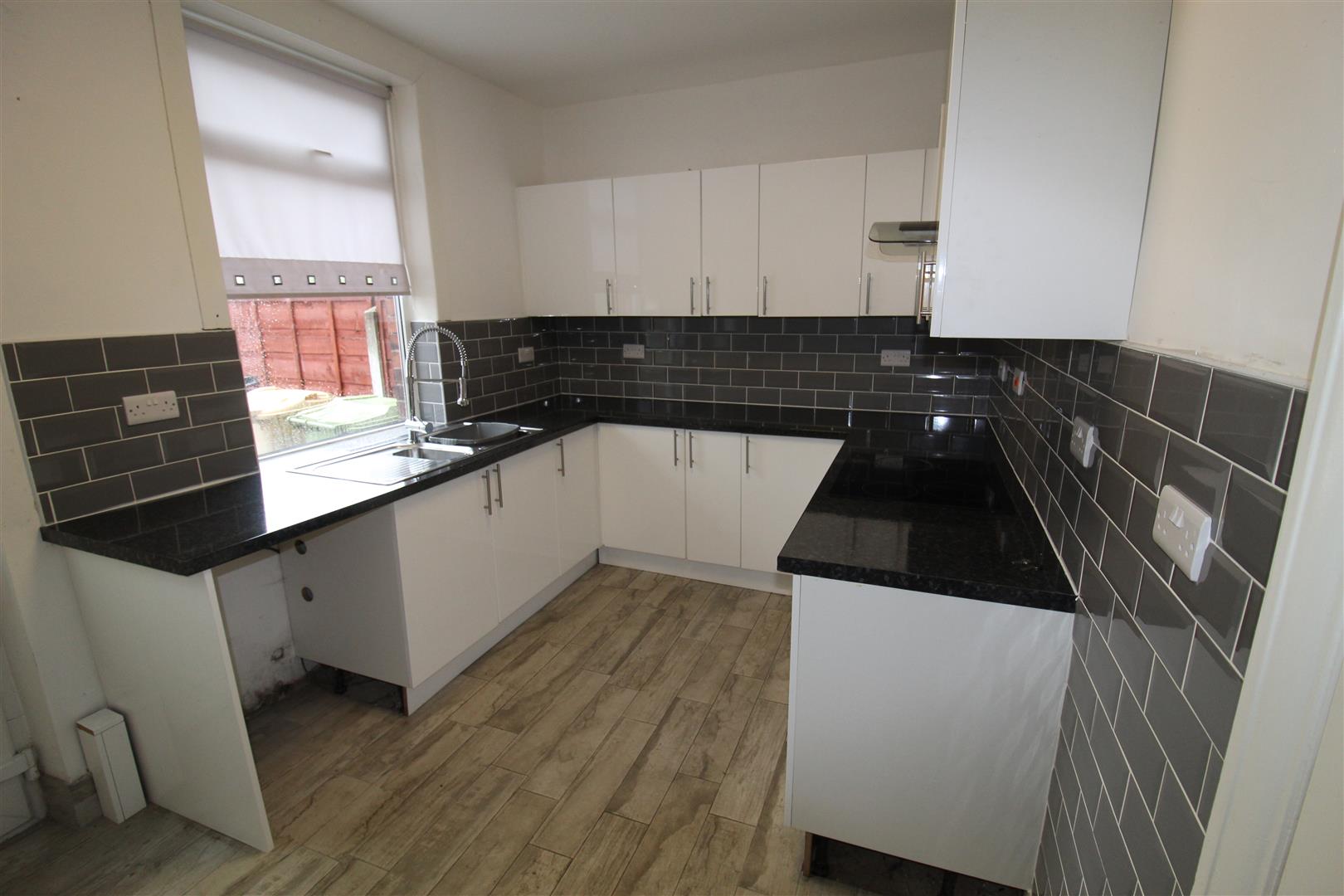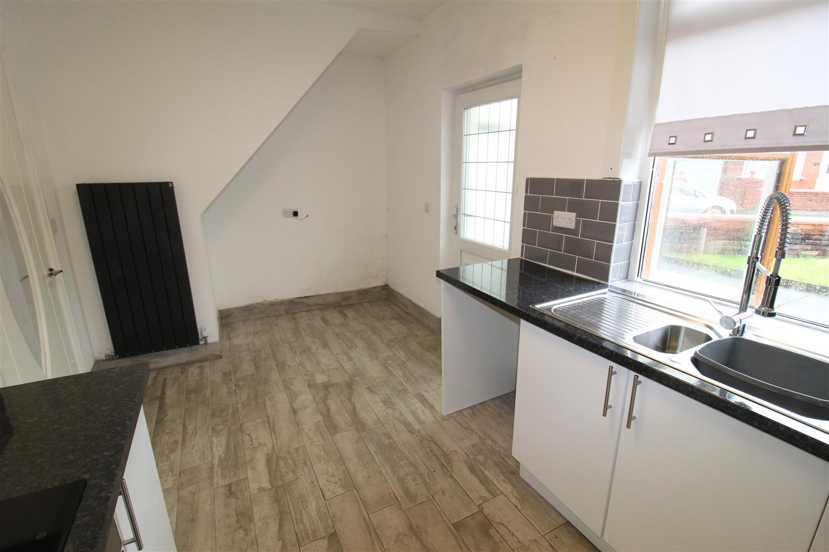 Fitted with a matching range of base and eye level units with worktop space over with drawers and round edged worktops, 1+1/2 bowl stainless steel sink unit with single drainer and mixer tap with ceramic tiled splashbacks, plumbing for automatic washing machine, space for fridge/freezer, fitted electric fan assisted oven, built-in four ring electric ceramic hob with extractor hood over, uPVC double glazed window to rear, column radiator, uPVC double glazed frosted entrance door to rear,: