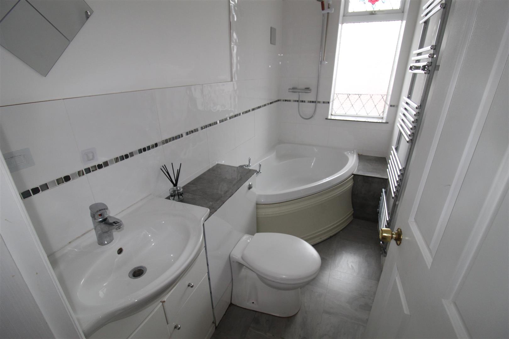 Three piece suite comprising deep panelled bath, vanity wash hand basin with cupboards under, drawers, mixer tap, tiled splashback and mirror, shower with above and close coupled WC, uPVC frosted double glazed window to front, heated towel rail.
