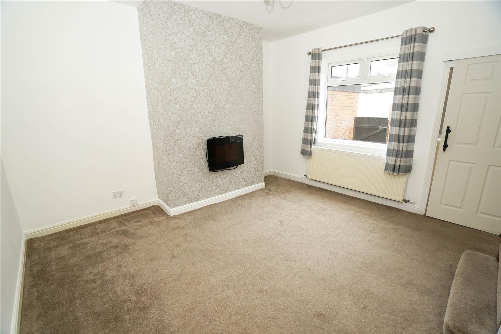 UPVC double glazed window to rear, wall mounted electric fire, built-in under-stairs storage cupboard, double radiator, stairs, sliding door, door to: