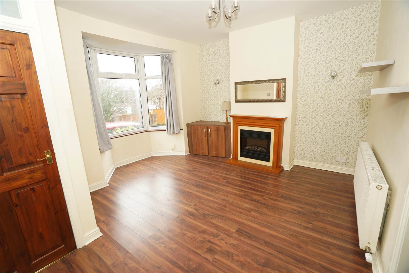 Bay window to front, log effect electric fire with set in and ornate timber surround, double radiator, laminate flooring, two wall lights, door to:
