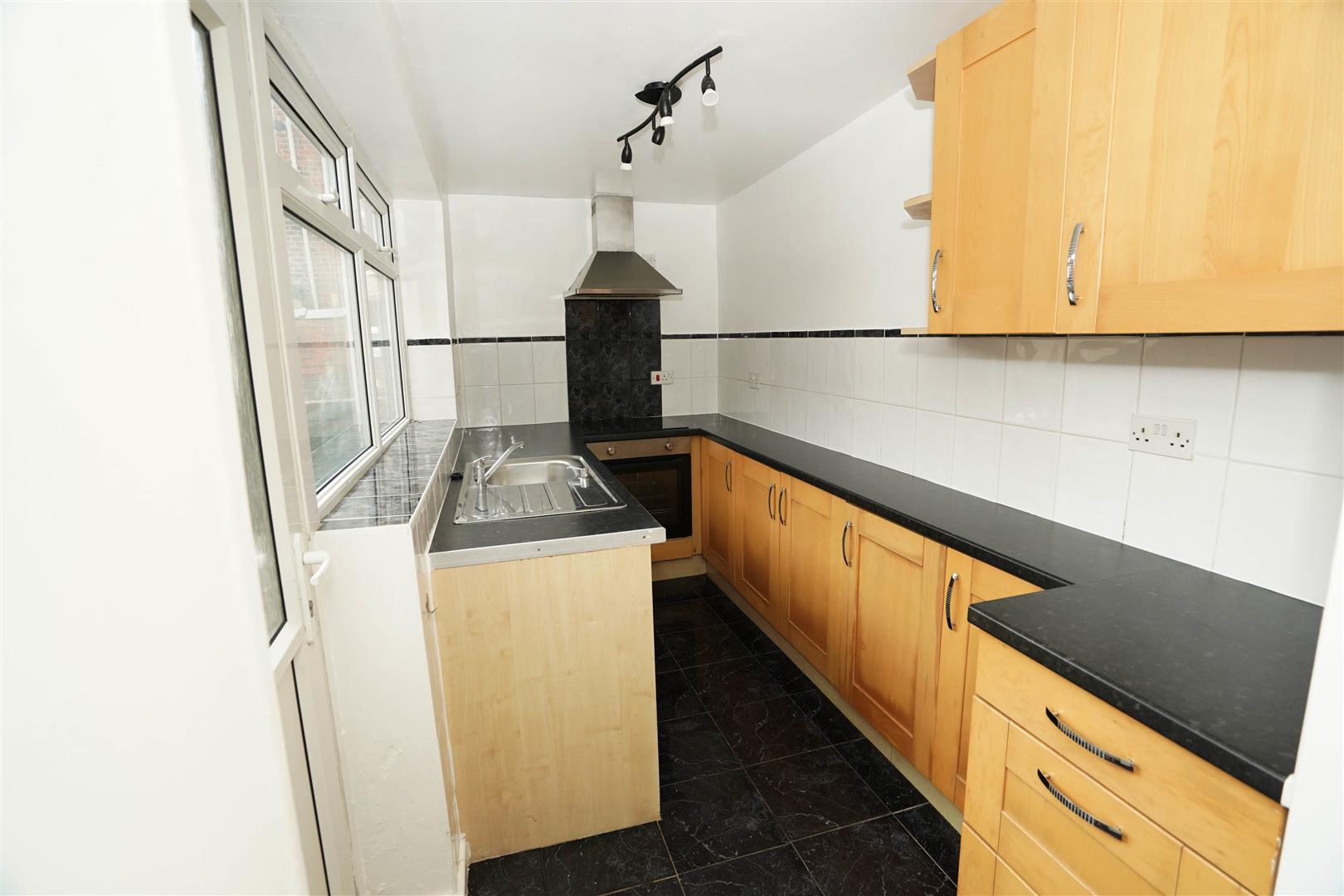 Fitted with a matching range of beech effect base and eye level units with contrasting round edged worktops, stainless steel sink unit with single drainer and mixer tap with tiled splashbacks, plumbing for washing machine, built-in electric fan assisted oven, four ring halogen hob with extractor hood over, uPVC double glazed window to side, ceramic tiled flooring, uPVC double glazed door to rear.