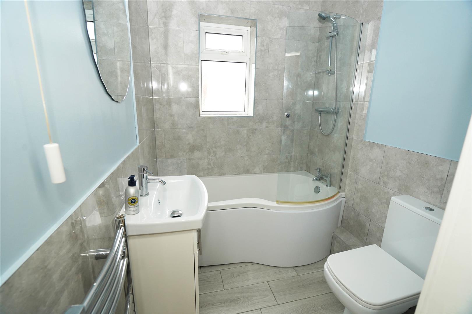 Fitted with three piece modern white suite with comprising, deep panelled p shaped bath with shower over, mixer tap and glass screen, inset wash hand basin in vanity unit with cupboards under and mixer tap and low-level WC, half height ceramic tiling to all walls, heated towel rail, uPVC frosted double glazed window to rear, ceramic tiled flooring.