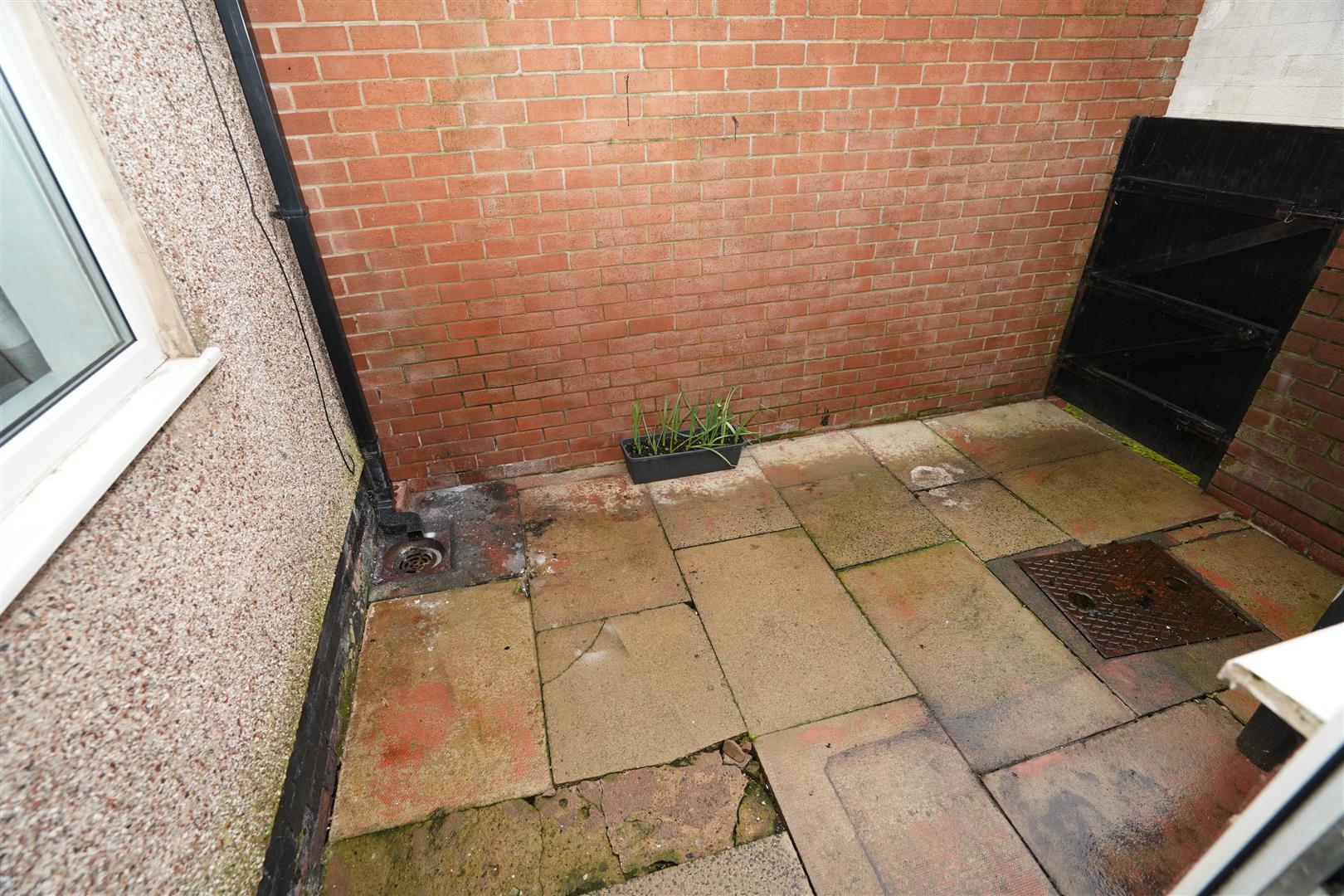 Rear, enclosed by brick wall to rear and side, paved patio, rear gated access.