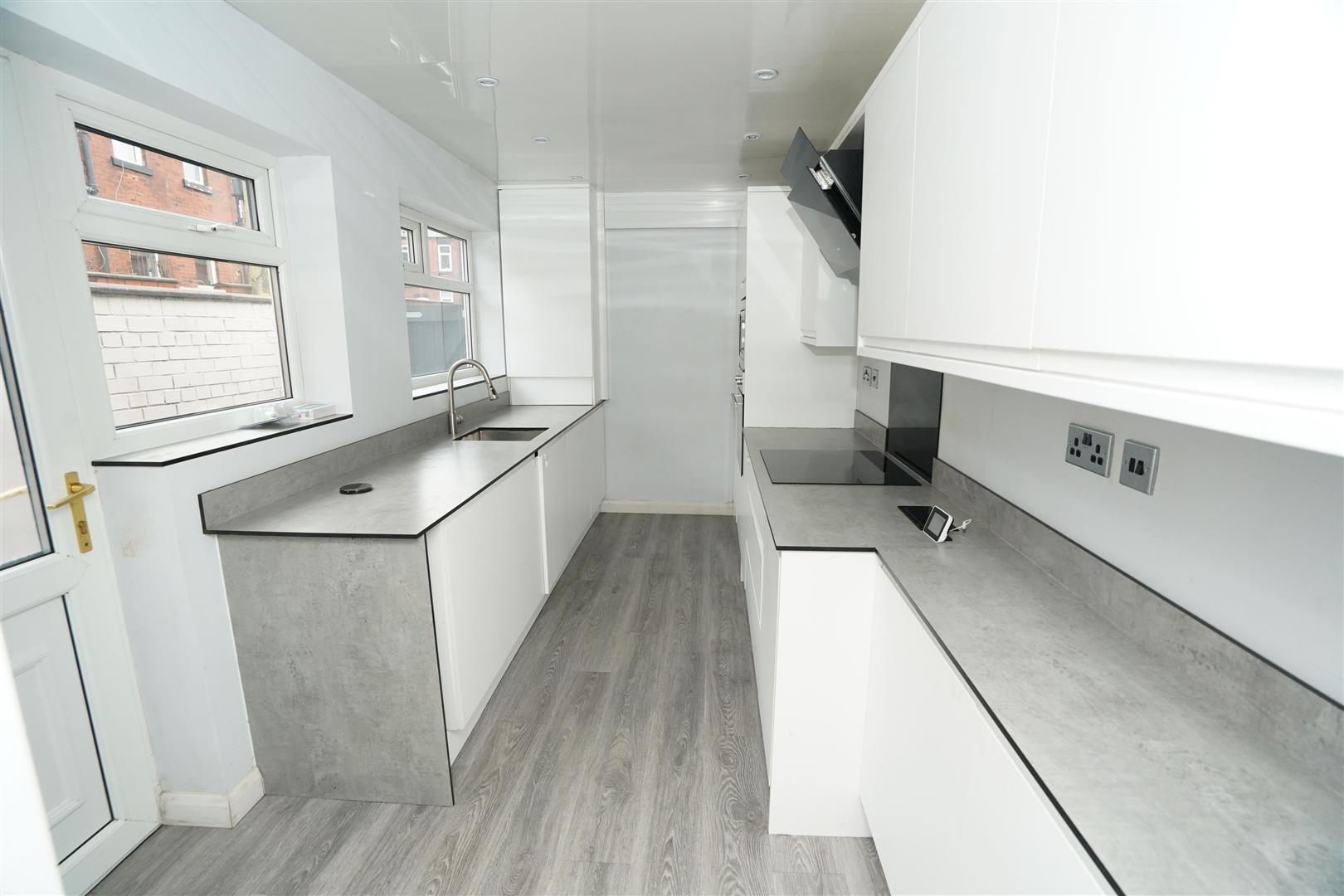 Fitted with a matching range of modern white gloss base and eye level units with underlighting, drawers, cornice trims and contrasting grey worktop with matching upstands, under counter stainless steel sink unit with swan neck mixer tap pop up plugs, integrated fridge/freezer, dishwasher and washing machine, built-in eye level electric fan assisted oven, four ring hob with extractor hood over, built-in, two uPVC double glazed windows to side, Vertical radiator, laminate flooring, wall mounted concealed gas combination boiler serving heating system and domestic hot water, uPVC double glazed door to rear.