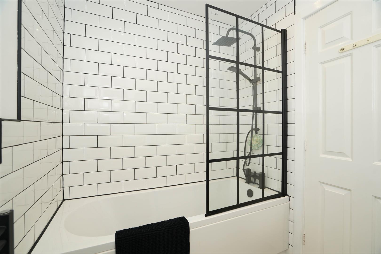 Recently three piece modern white suite with comprising, deep panelled bath with rainfall fall shower over and glass screen, inset wash hand basin in vanity unit with cupboards under and mixer tap and low-level WC, ceramic tiling to all walls, heated towel rail, extractor fan, uPVC frosted double glazed window to rear, ceramic tiled flooring.