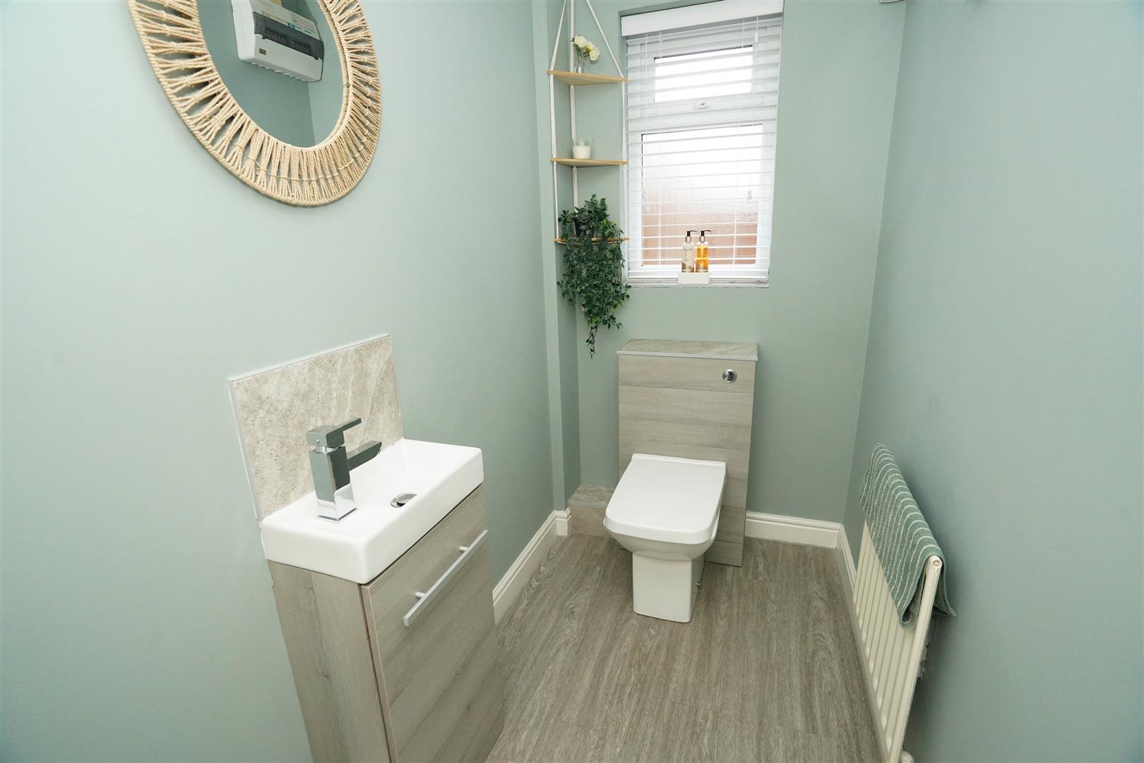 UPVC frosted double glazed window to side, fitted with two piece modern white suite comprising, inset wash hand basin in vanity unit with cupboards under, mixer tap and tiled splashback and WC with hidden cistern, radiator, Luxury vinyl flooring.