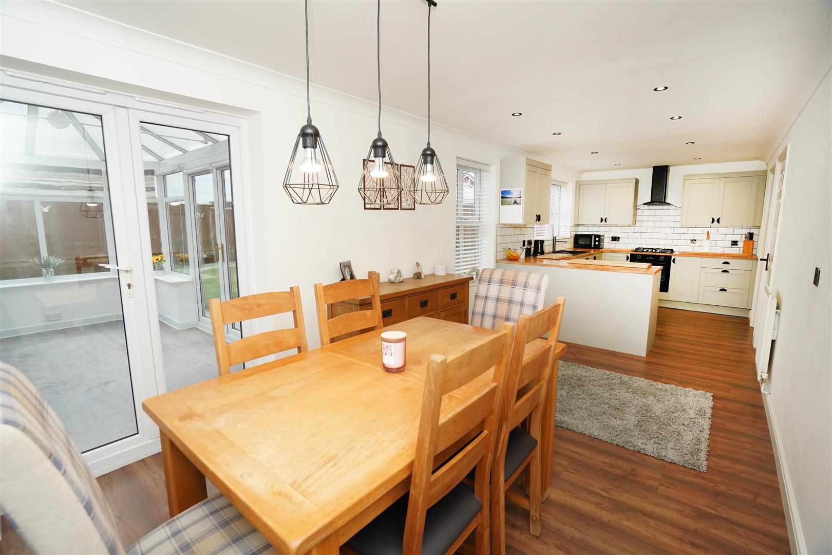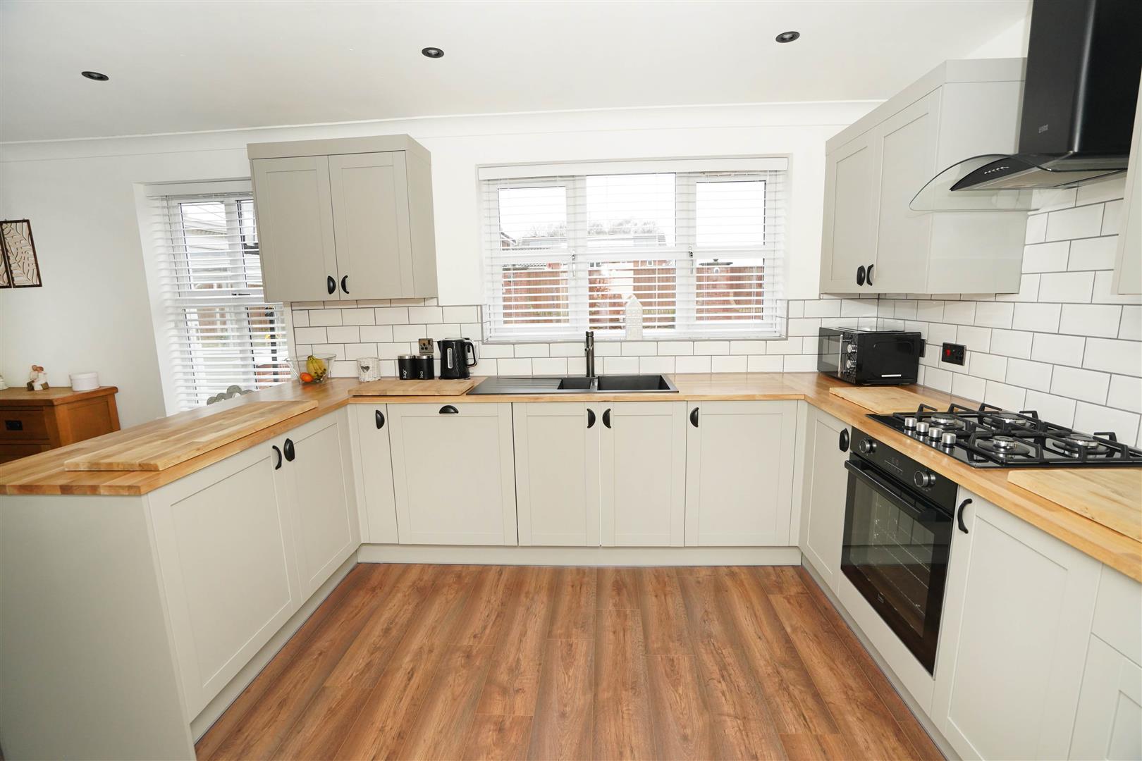 Fitted with a matching range of pale grey base units with contrasting oak worktop space, 1+1/2 bowl composite sink unit with single drainer, mixer tap and tiled splashbacks, integrated dishwasher, built-in electric fan assisted oven, four ring gas with extractor hood over, two uPVC double glazed windows to rear, radiator, laminate flooring, coving to ceiling with recessed spotlights, double door, door to: