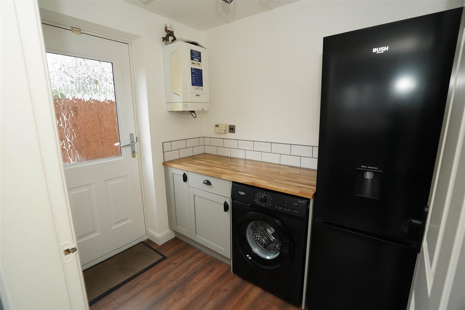 Base units with oak worktop space over, plumbing for washing machine, space for fridge/freezer, radiator, laminate flooring, wall mounted gas boiler serving heating system and domestic hot water, door to: