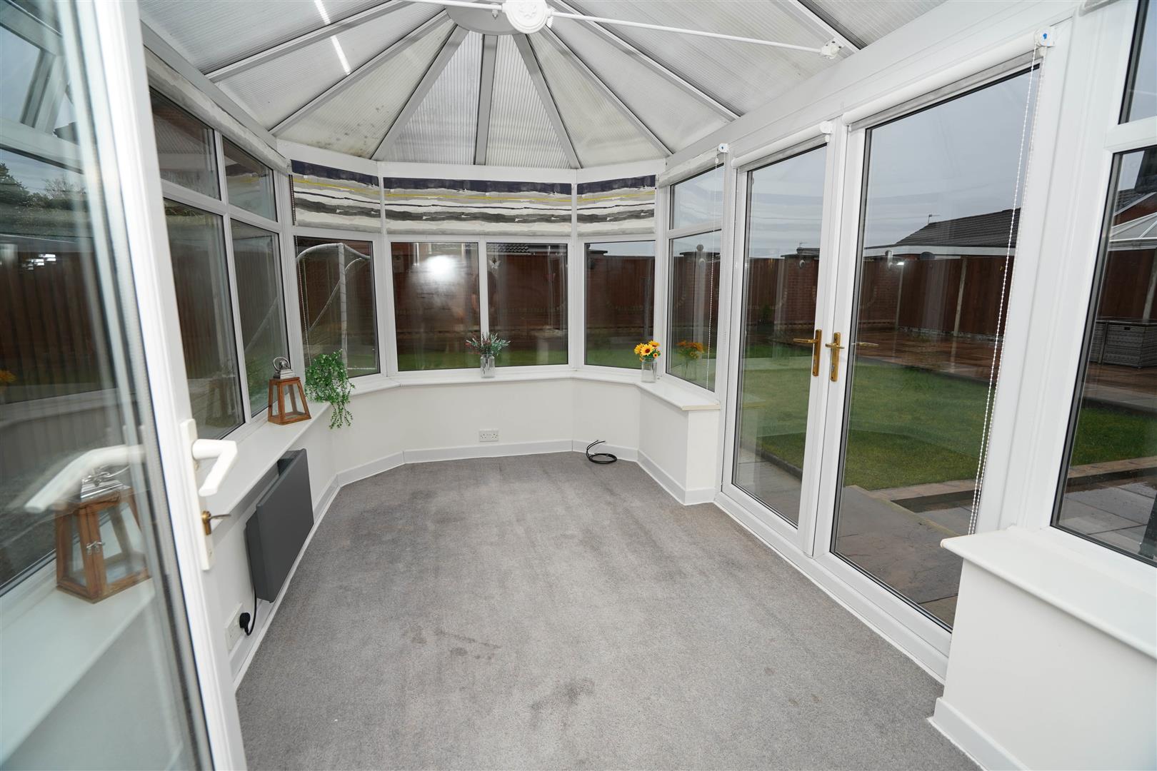 Half brick and double glazed construction with uPVC double glazed windows, polycarbonate roof and power and light connected, window to rear, five windows to side, electric panel heater, double door, door to: