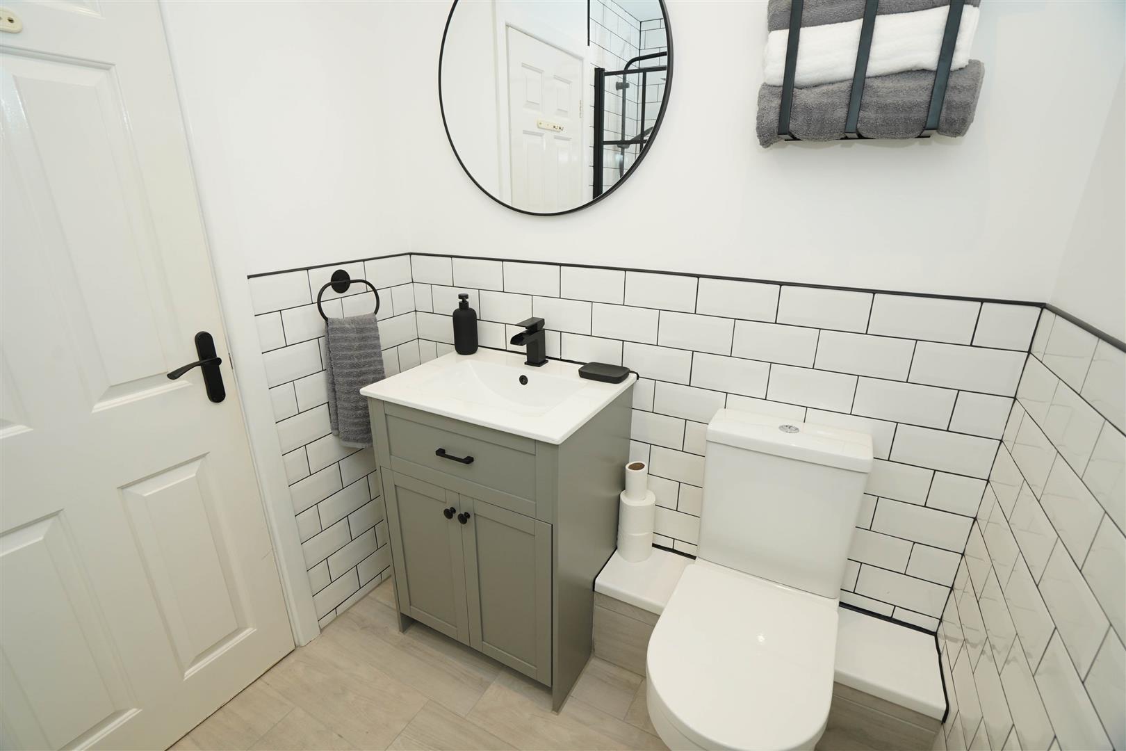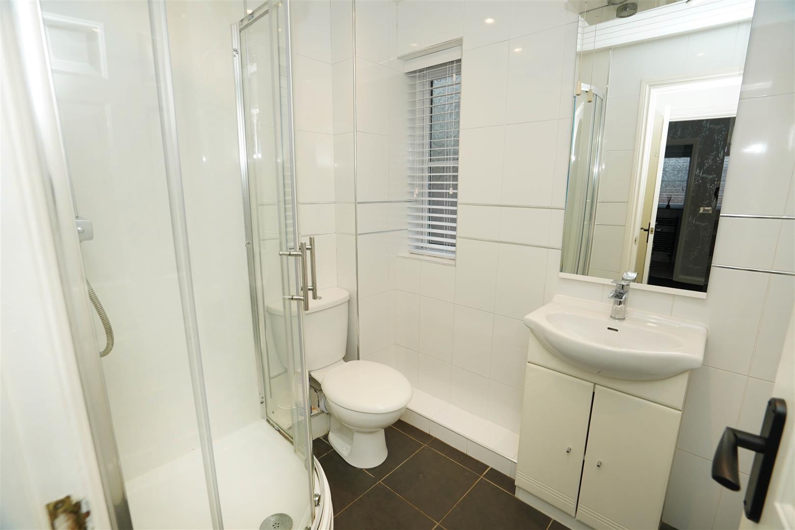 Fitted with three piece modern white suite with comprising, inset wash hand basin in vanity unit with cupboards under and mixer tap, tiled shower enclosure with rainfall fall shower over and low-level WC, full height ceramic tiling to all walls, extractor fan, wall mounted mirror with lighting over, shaver point, uPVC frosted double glazed window to front, radiator, ceramic tiled flooring.