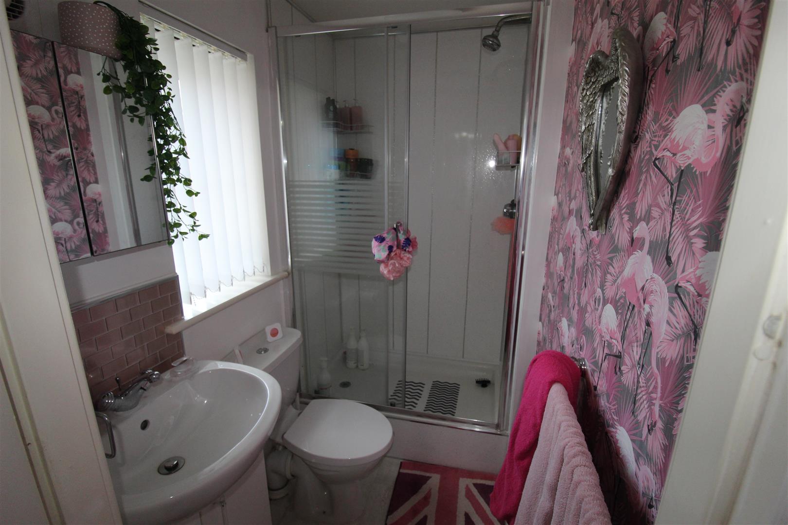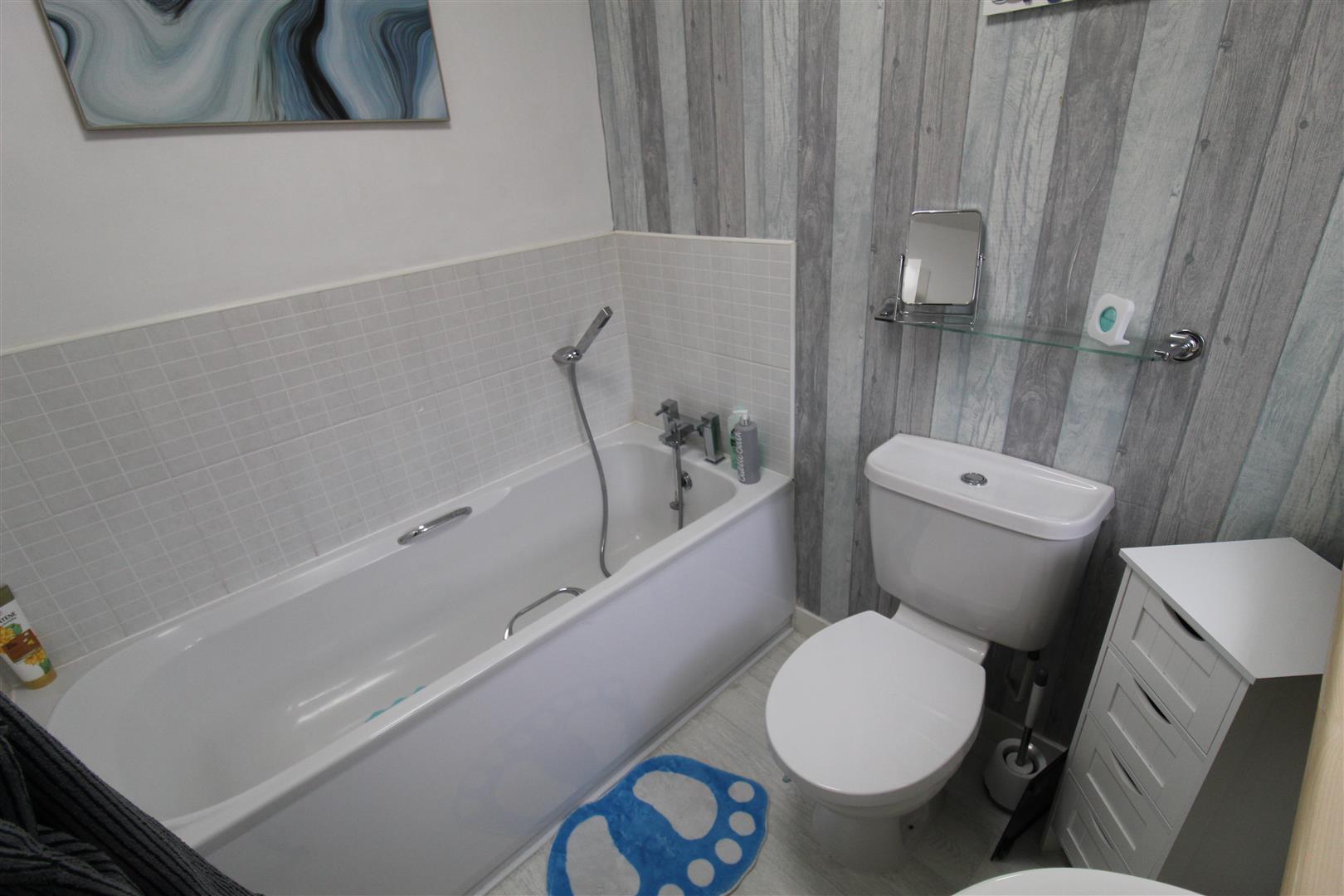 Storage cupboard, uPVC frosted double glazed window to front, two piece suite comprising and vanity wash hand basin with storage under and tiled splashback, radiator.