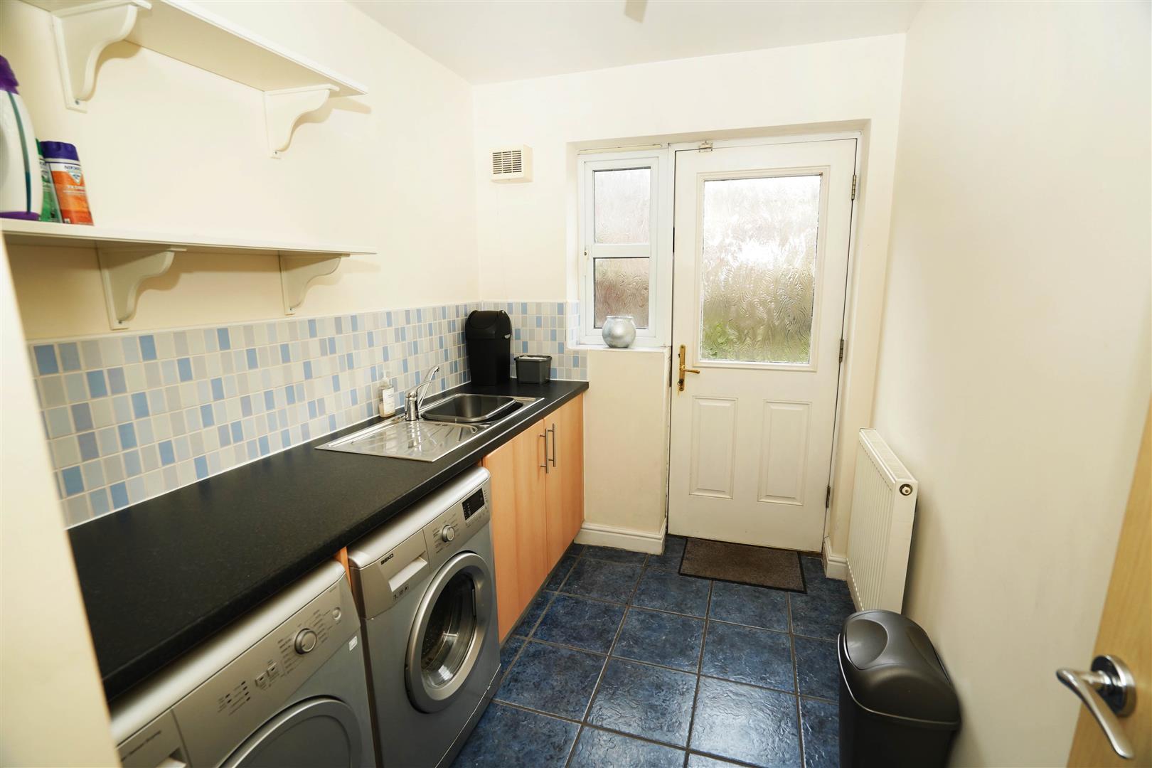 Fitted with a matching range of base units with contrasting round edged worktops, stainless steel sink unit with single drainer and mixer tap with tiled splashbacks, plumbing for washing machine, space for tumble dryer, uPVC frosted double glazed window to rear, radiator, ceramic tiled flooring, double glazed door to garden, door to: