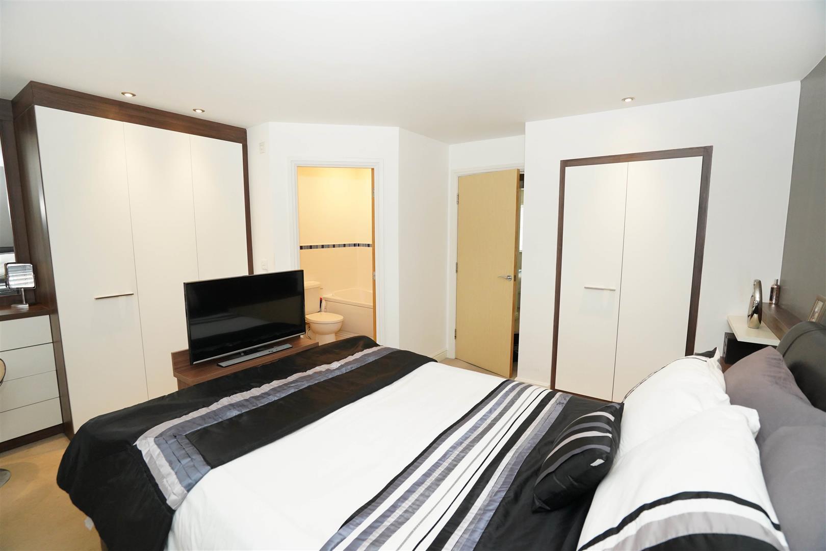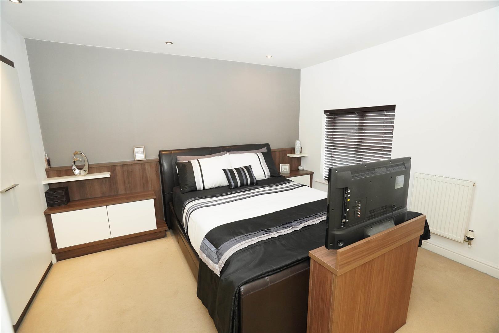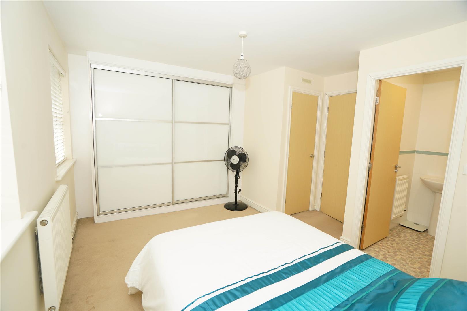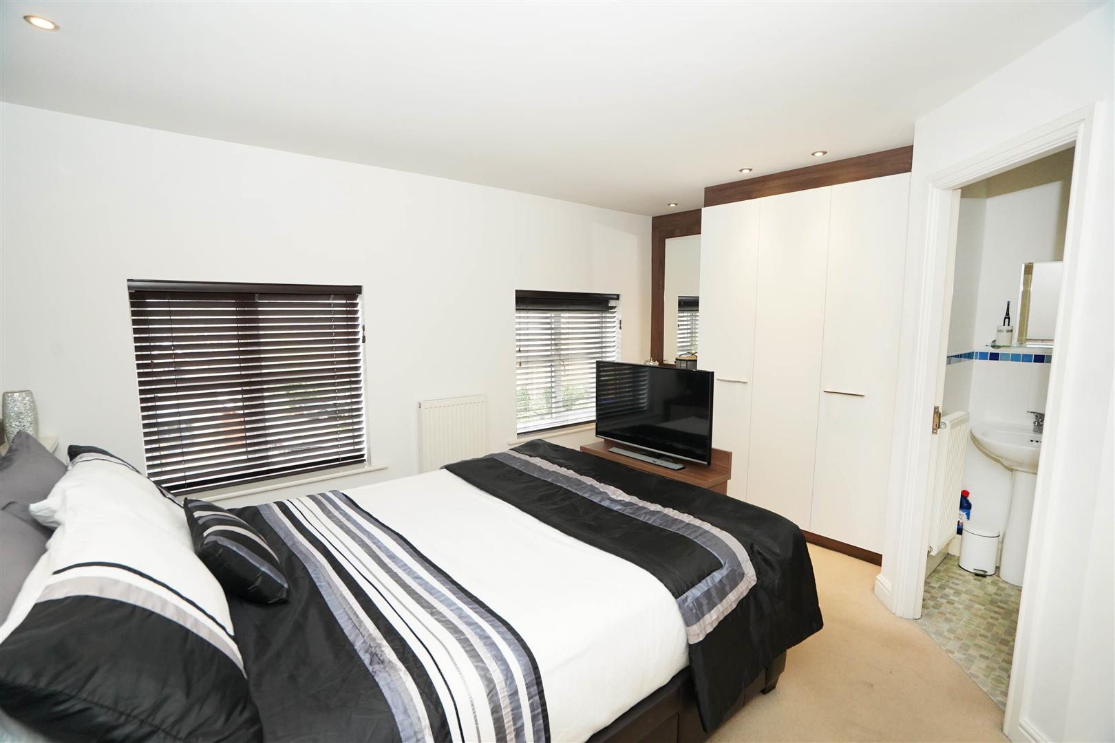 Two uPVC double glazed windows to front, fitted bedroom suite with a range of wardrobes comprising built-in double wardrobe(s), further built-in triple wardrobe(s), fitted matching vanity mirror, bedside cabinets and drawers, radiator, door to: