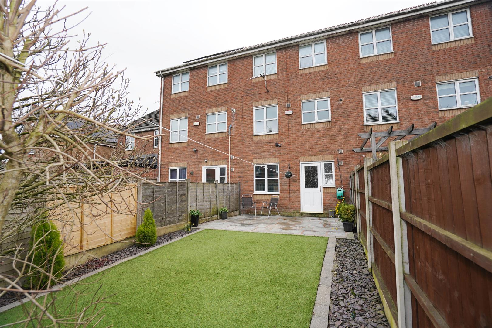 Rear garden, enclosed by timber fencing to rear and sides, large paved sun patio with artificial lawned area and mature shrub borders.
