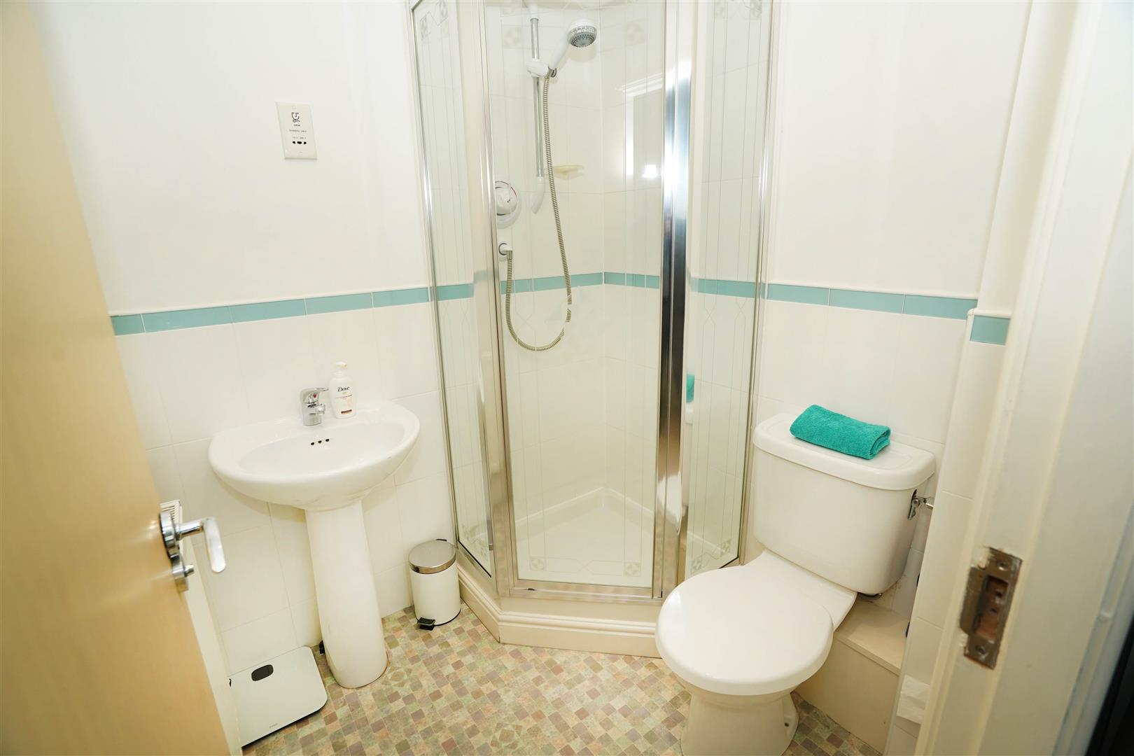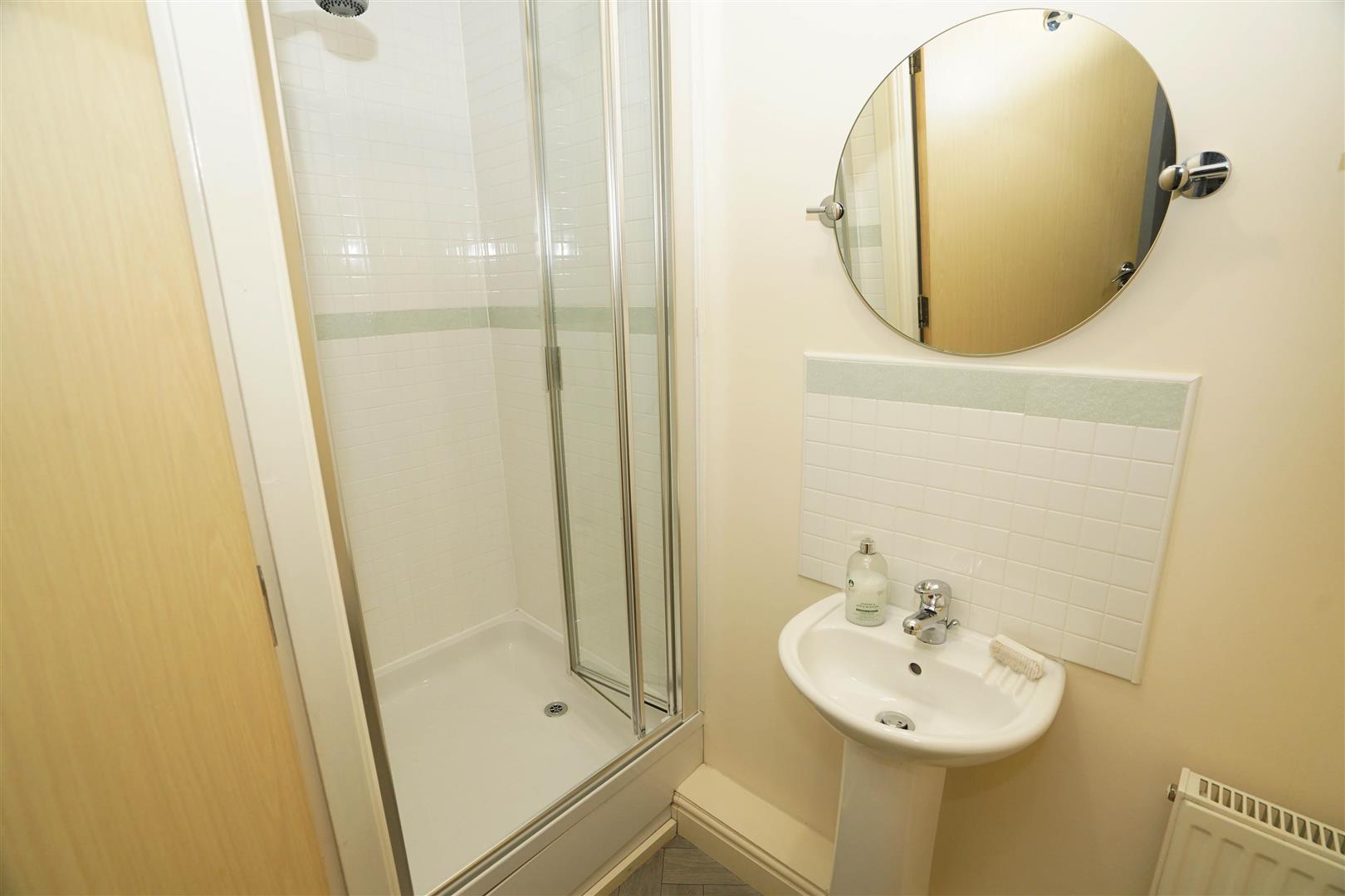 Fitted with three piece modern white suite with comprising, pedestal wash hand basin, tiled shower enclosure and low-level WC, half height ceramic tiling to all walls, extractor fan, shaver point, radiator.