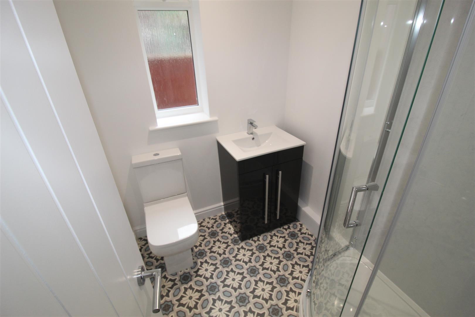 Three piece suite comprising vanity wash hand basin with storage under and mixer tap, shower cubicle with glass screen and low-level WC, uPVC frosted double glazed window to side, heated towel rail.