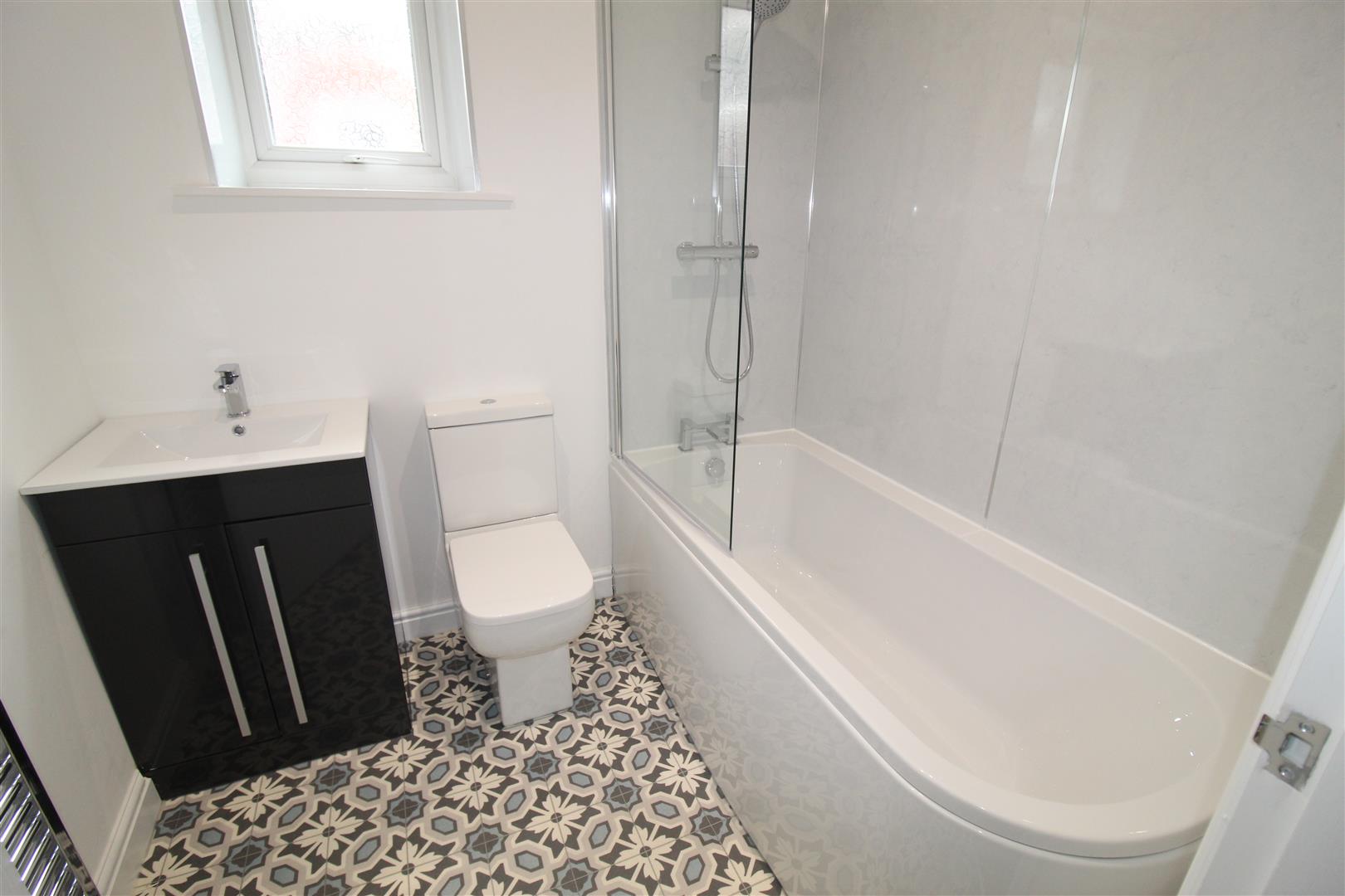 Three piece suite comprising deep panelled bath with mixer tap, vanity wash hand basin with base cupboard and mixer tap, shower with over and glass screen and low-level WC, uPVC frosted double glazed window to side, heated towel rail.