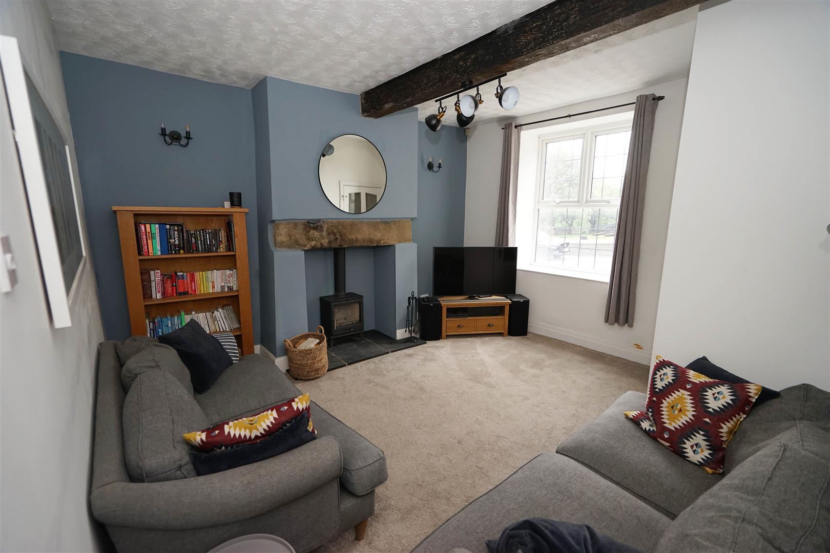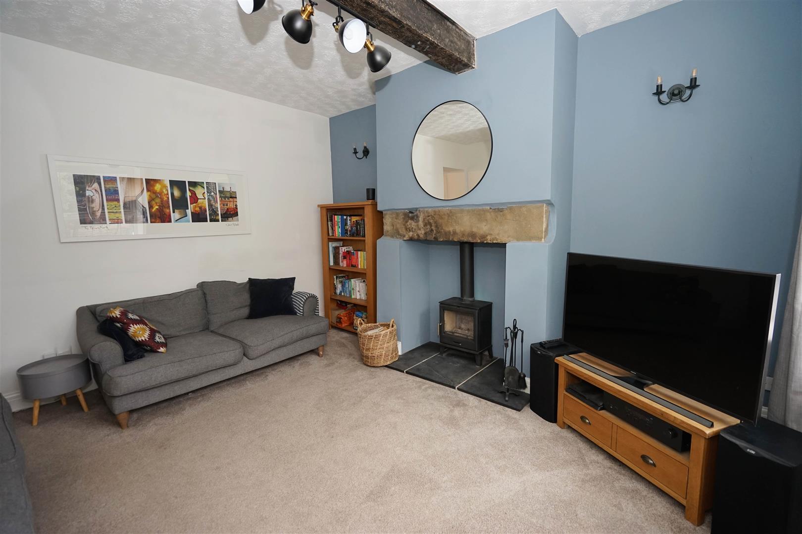 UPVC double glazed leaded window to front, feature fireplace with slate hearth, solid fuel burner stove with glass door in chimney, stone mantle over, double radiator, ceiling with feature beams, door to: