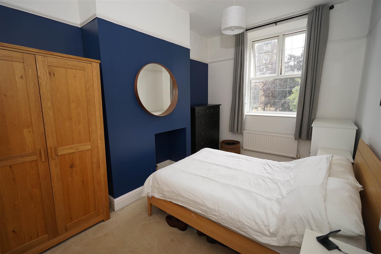 UPVC double glazed leaded window to rear, built-in over-stairs storage cupboard, built-in wardrobe, double radiator, door to: