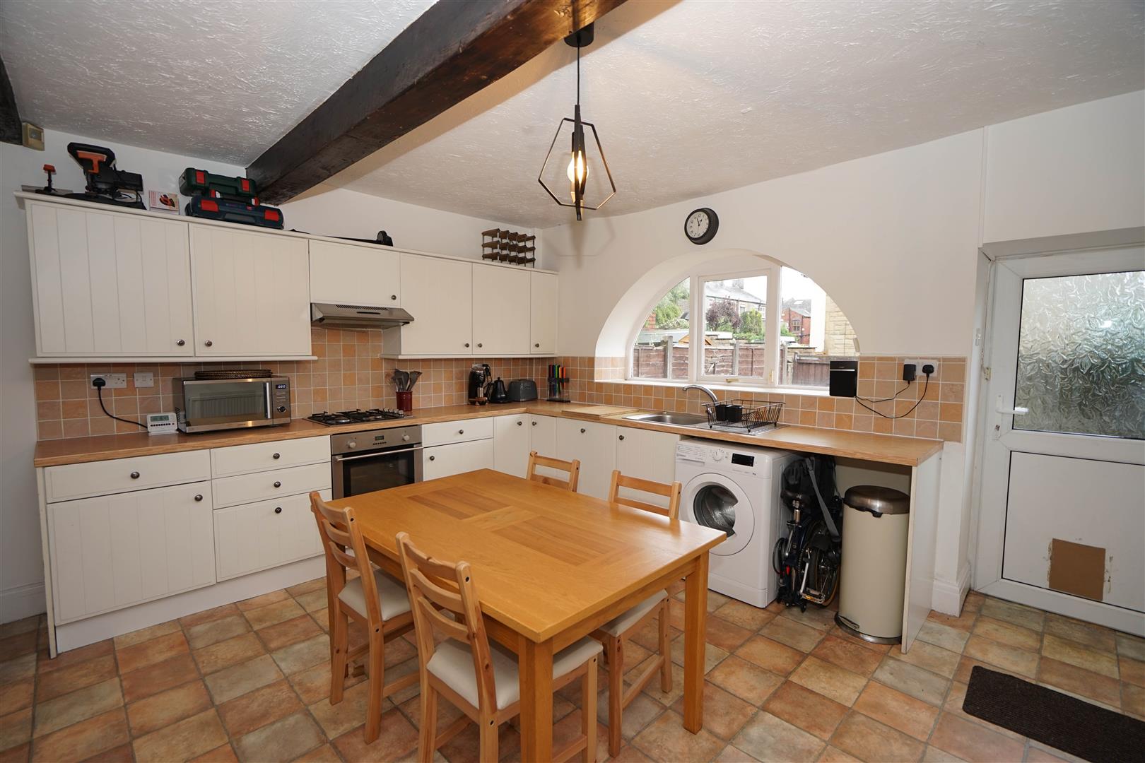 Fitted with a matching range of cream base and eye level units with cornice trims and complementary round edged worktops, stainless steel sink unit with single drainer and mixer tap with tiled splashbacks, plumbing for washing machine, space for fridge/freezer, built-in electric fan assisted oven, four ring gas hob with extractor hood over, Feature arched window to rear, double radiator, vinyl flooring, ceiling with feature beams, stairs to first floor landing, uPVC double glazed door to garden.