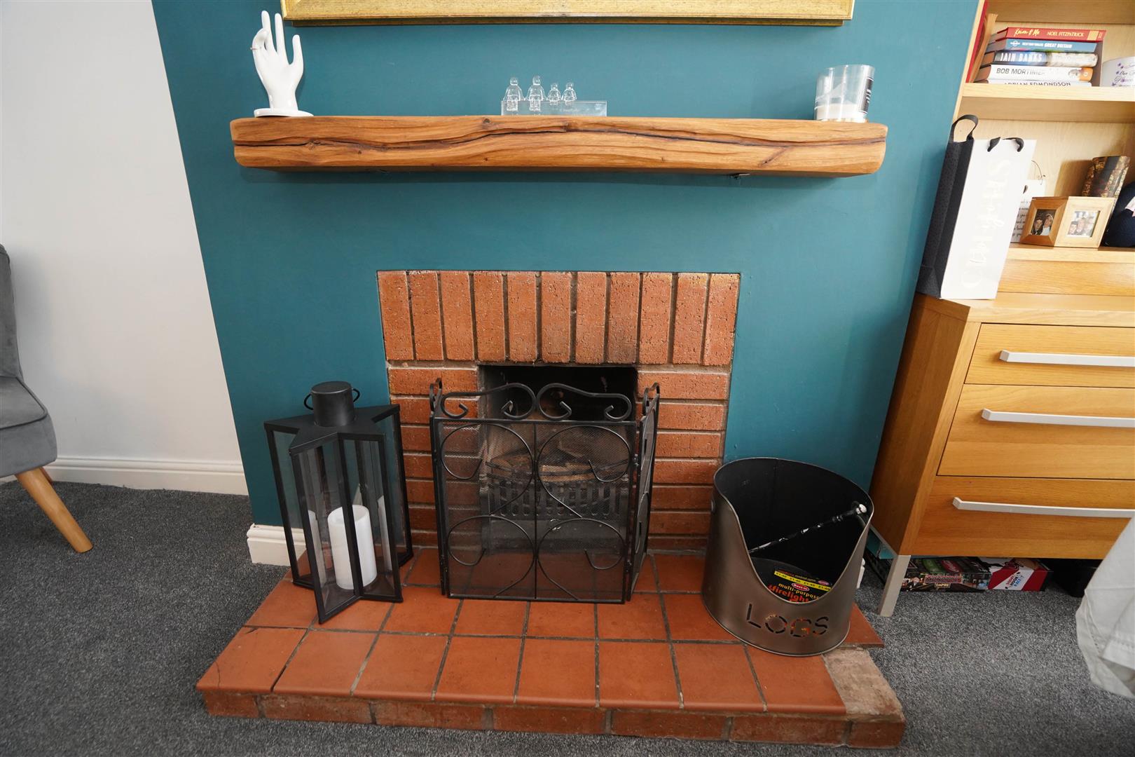 UPVC double glazed bay window to front, uPVC double glazed window to rear, open fire set in brick built and cast- grate in chimney, timber mantle over, built-in under-stairs storage cupboard, two radiators, Part fitted carpet part laminate flooring, two wall lights, coving to ceiling, carpeted stairs to first floor landing, door to: