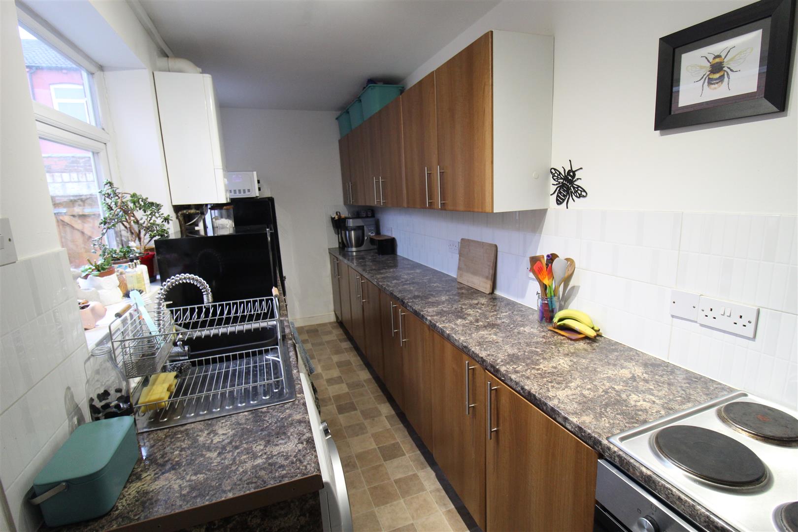 Fitted with a matching range of base and eye level units with drawers and contrasting worktop space, stainless steel sink unit with single drainer and mixer tap with tiled splashbacks, wall mounted gas combination boiler serving heating system and domestic hot water, plumbing for washing machine, space for fridge and freezer, built-in electric fan assisted oven, four ring electric hob, two uPVC double glazed windows to side, uPVC double glazed door to rear.