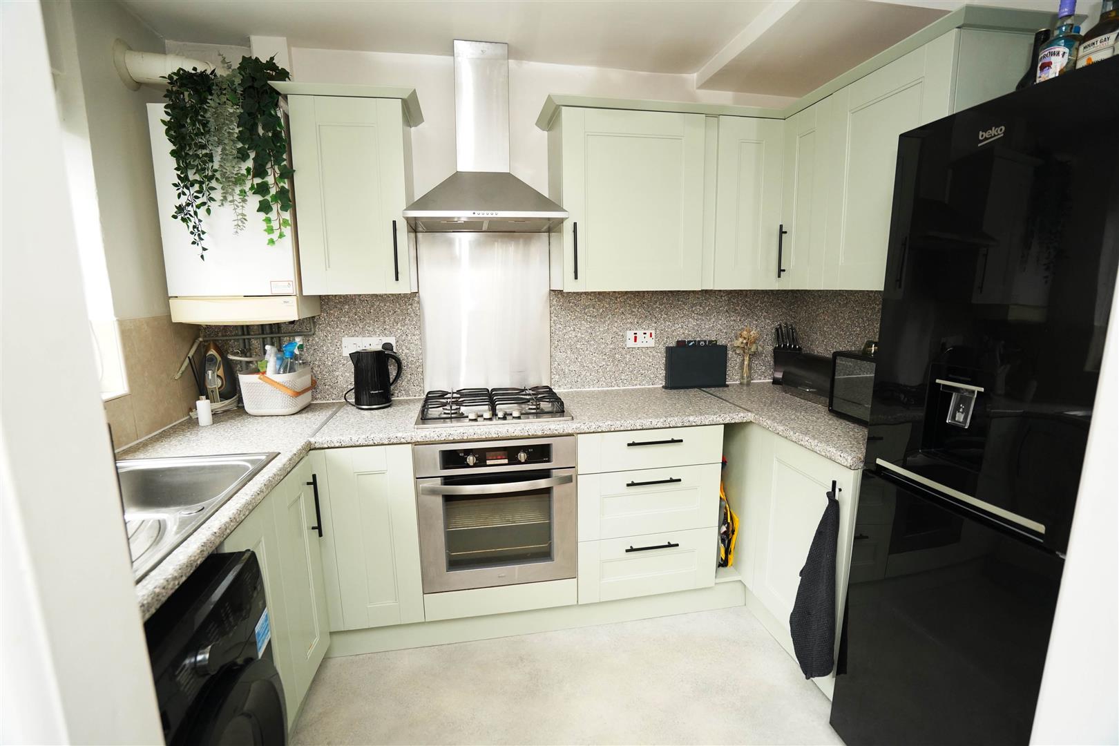 Fitted with a matching range of pale green base and eye level units with drawers and contrasting round edged worktops, stainless steel sink unit with single drainer and mixer tap with tiled splashbacks, wall mounted gas combination boiler serving heating system and domestic hot water, plumbing for washing machine, space for fridge/freezer, electric fan assisted oven, four ring gas with extractor hood over, uPVC double glazed window to rear, vinyl flooring.