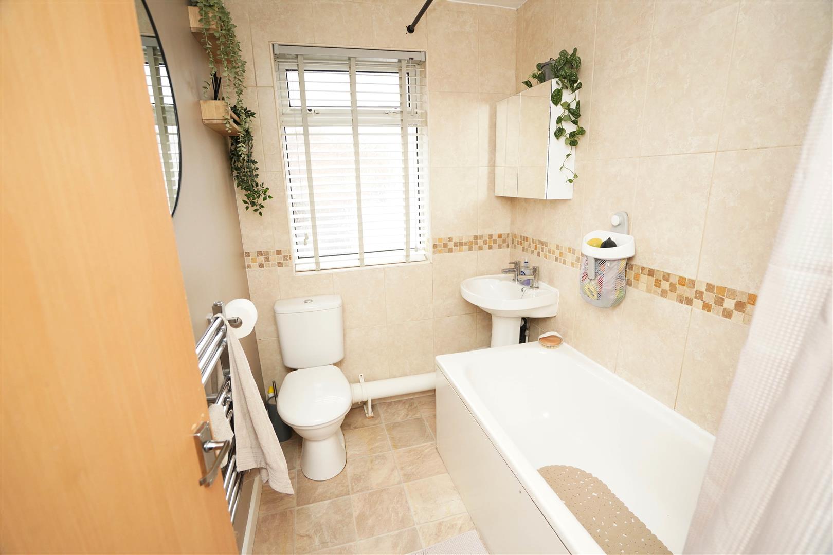 Fitted with three piece white suite with comprising, deep panelled bath with shower over, pedestal wash hand basin and low-level WC, full height ceramic tiling to three walls, heated towel rail, extractor fan, uPVC frosted double glazed window to rear, vinyl flooring.