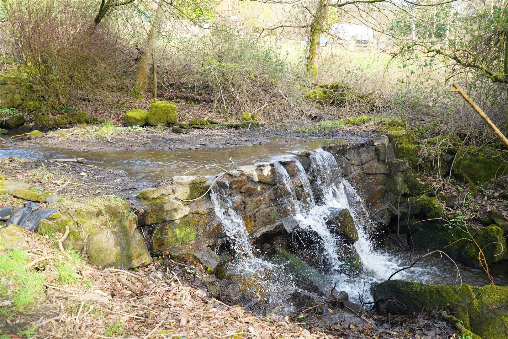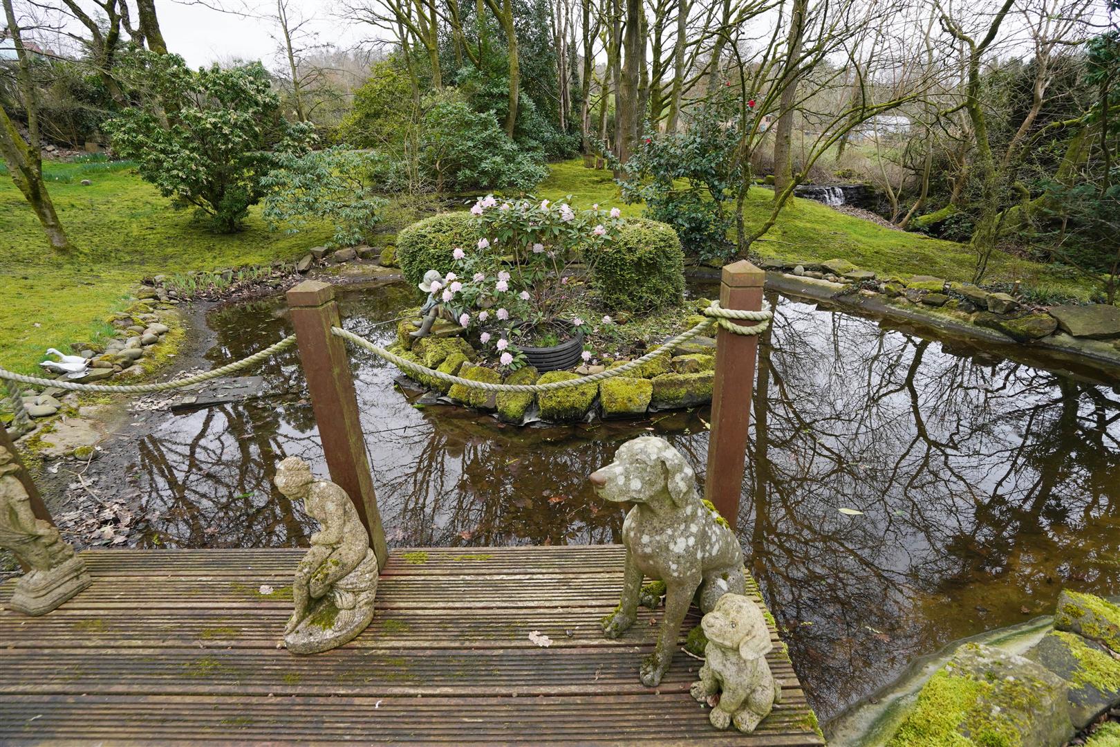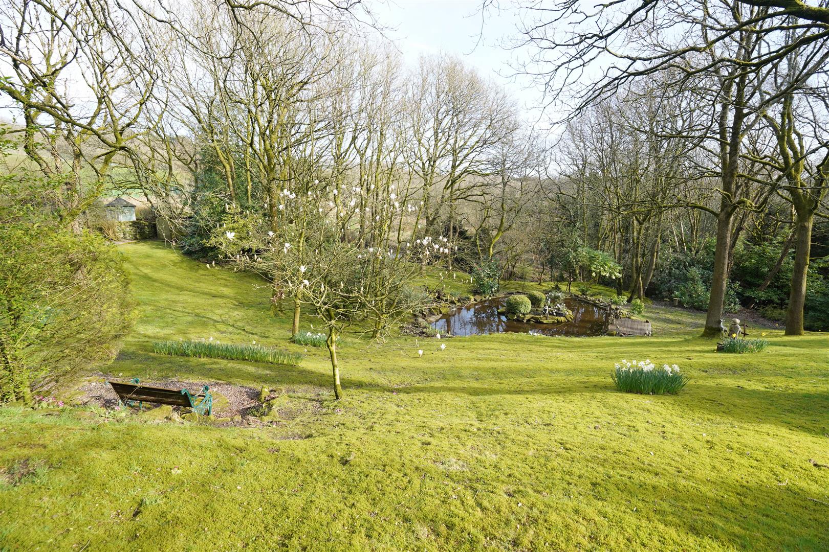 Rear gardens, enclosed by stone wall and mature hedge to rear and sides, large paved sun patio with lawned area and mature flower and shrub borders, ornamental pond with waterfall, paved pathway, timber garden shed.
