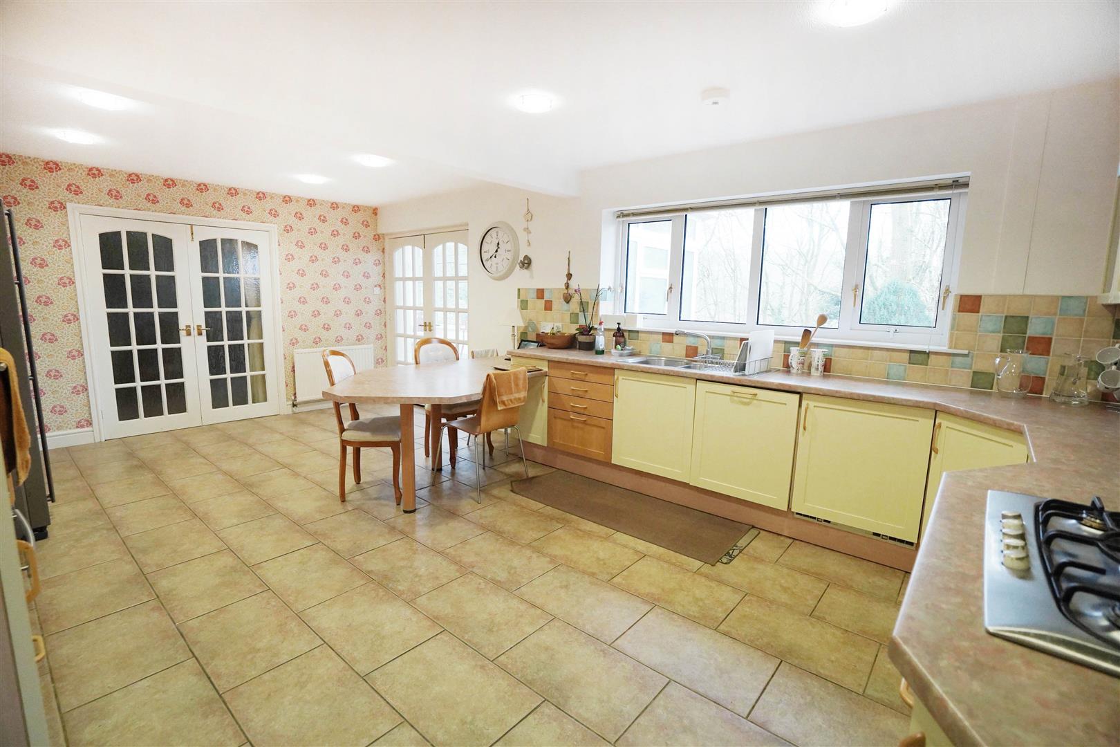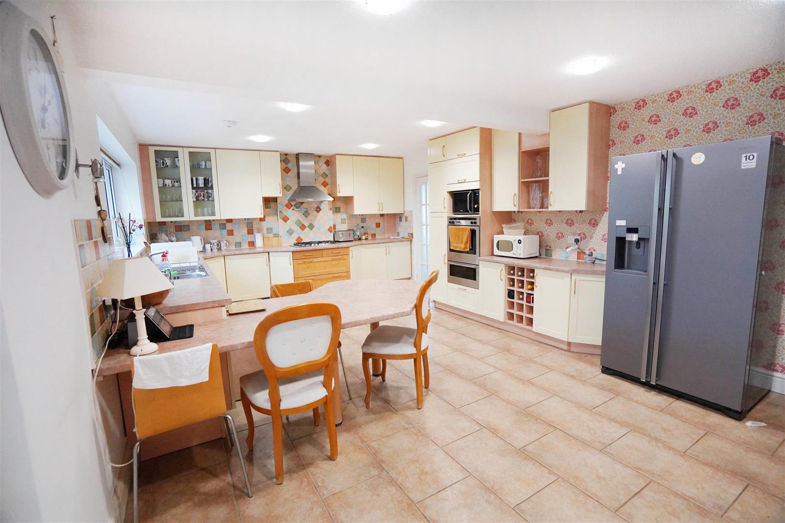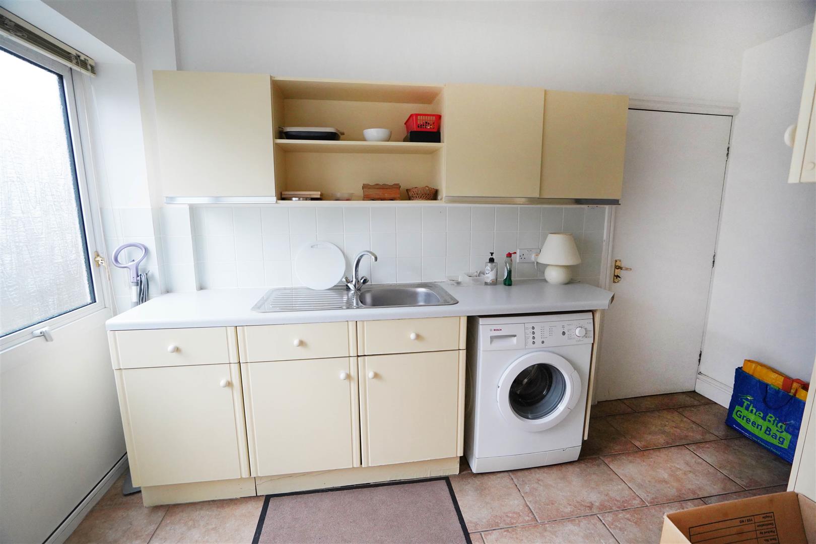 Fitted with a matching range of base and eye level units, plumbing for washing machine, space for fridge/freezer, window to side, radiator, ceramic tiled flooring, uPVC double glazed side door to garden, door to garage :