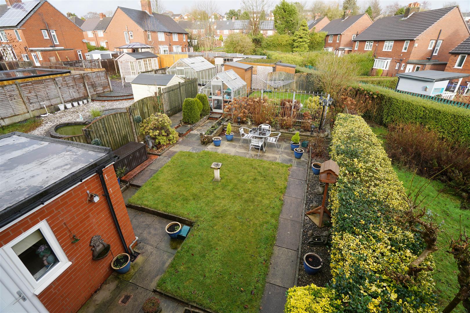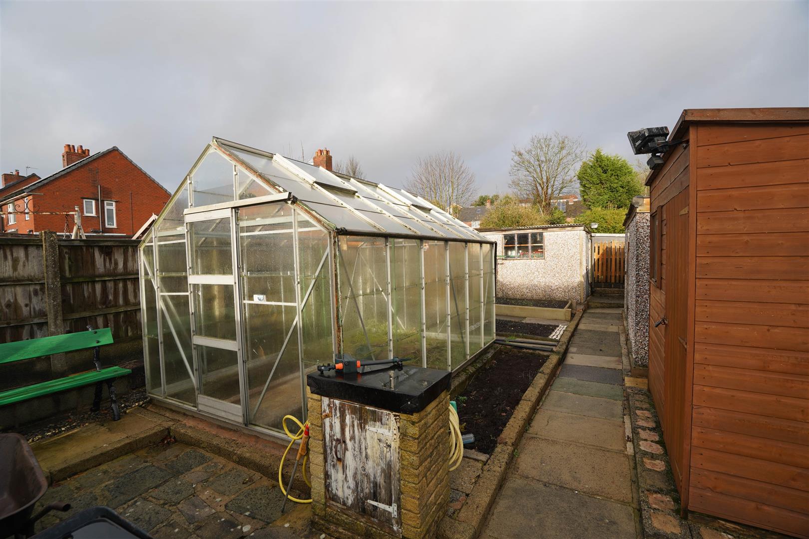 Rear gardens large paved patio with paved pathway leading to a lawned area two aluminium greenhouses, timber garden shed with power and light connected, two large workshop buildings with power and light connected. rear gated access.