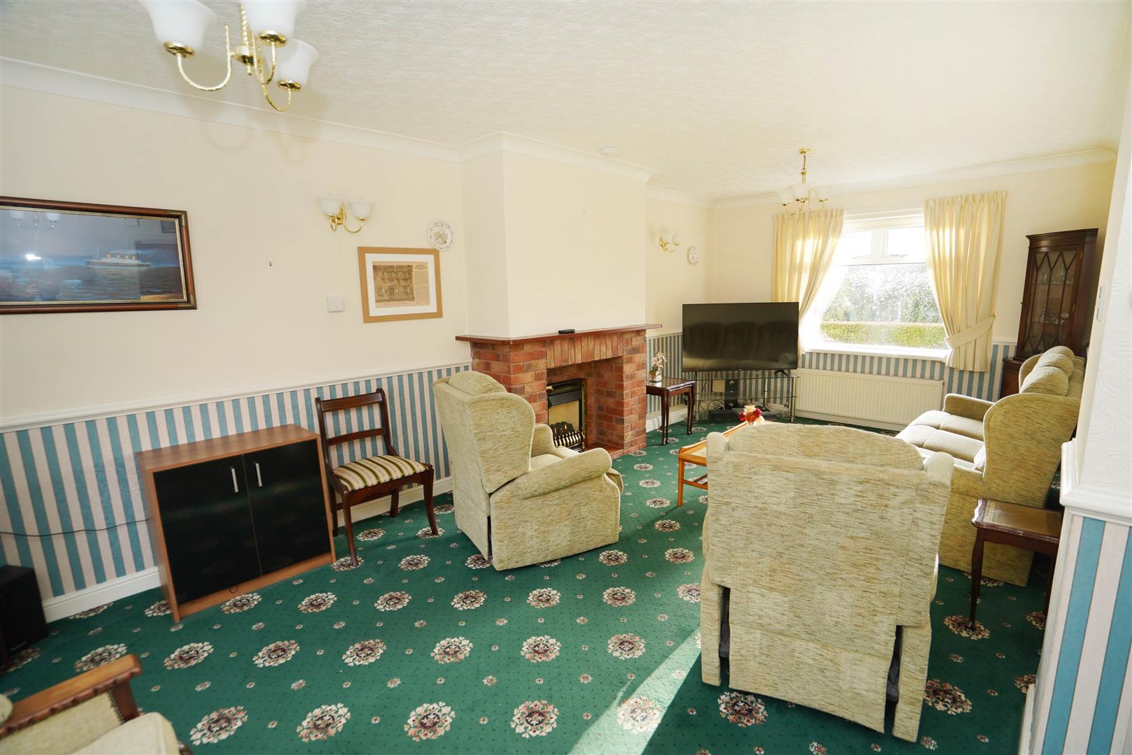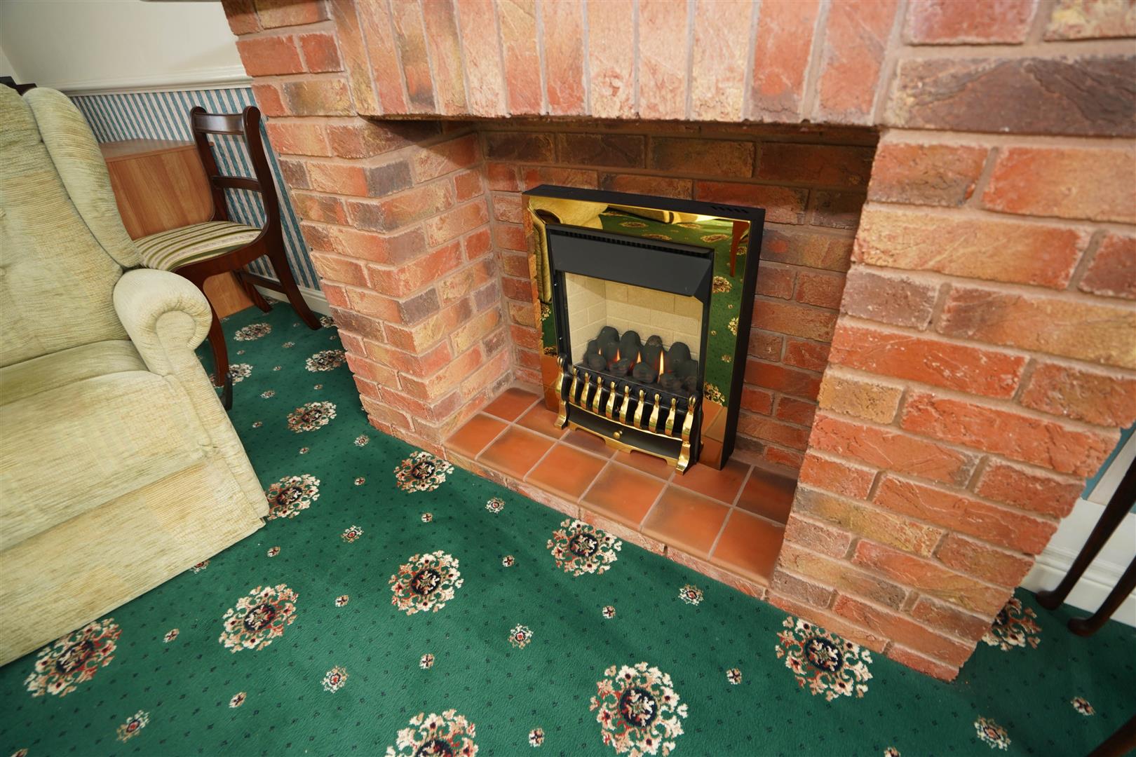 UPVC double glazed window to rear, window to front, Remote controlled living flame effect gas fire set in brick built surround and tiled hearth. two double radiators, dado rail, two wall lights, coving to ceiling.