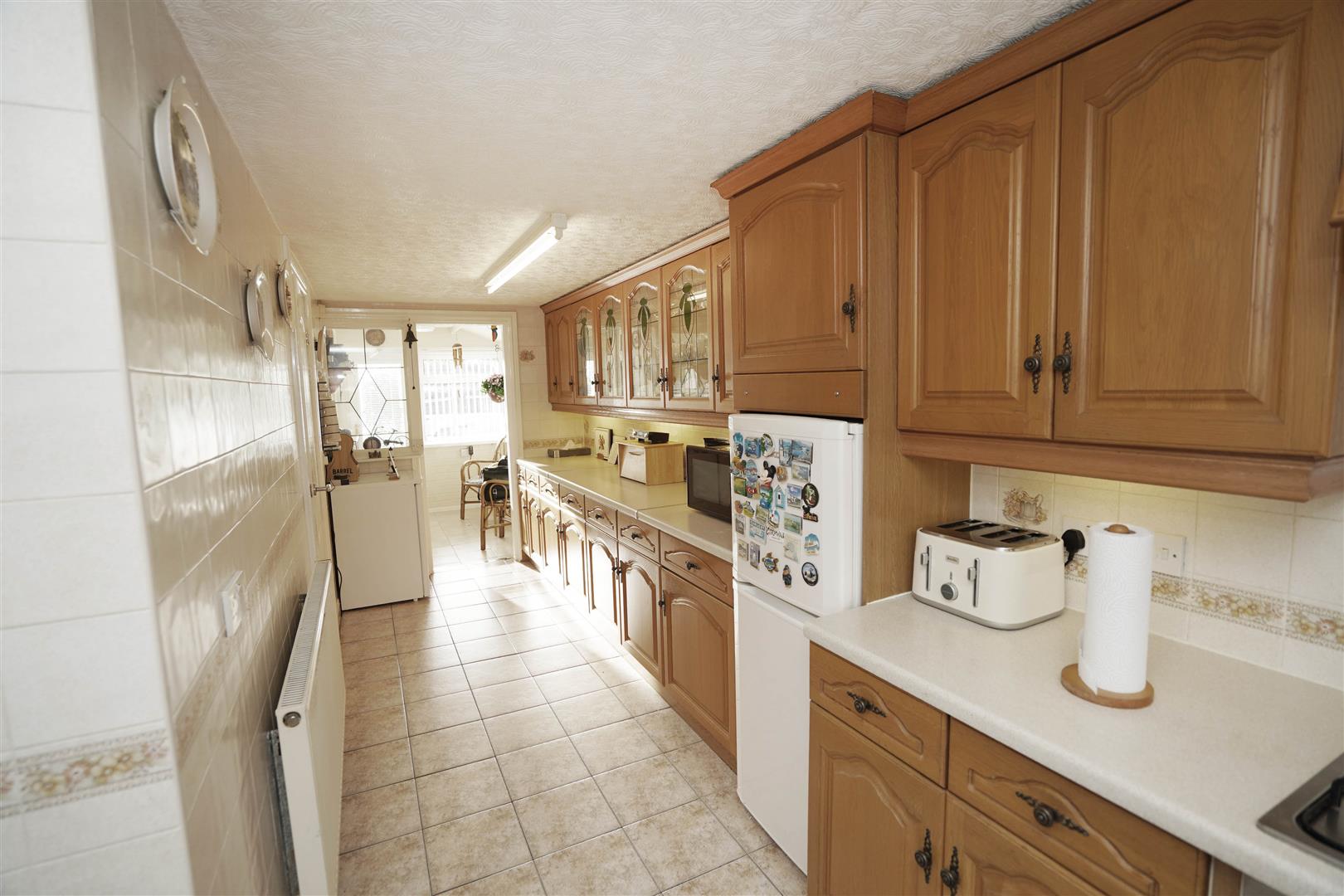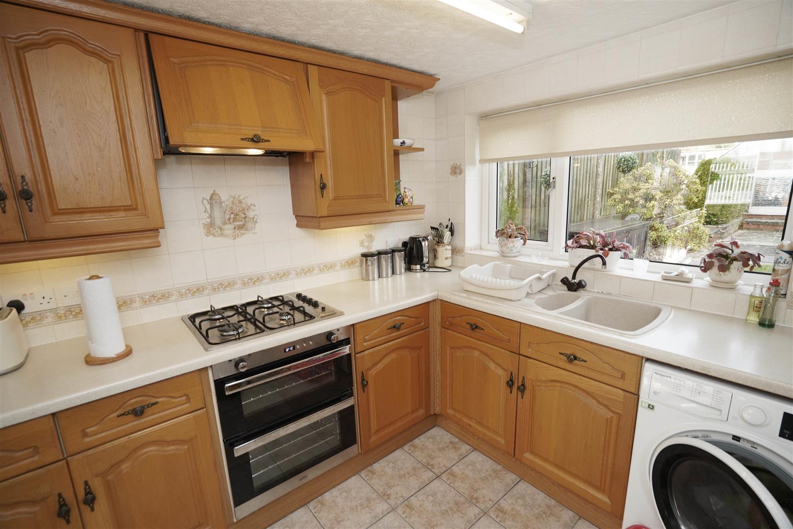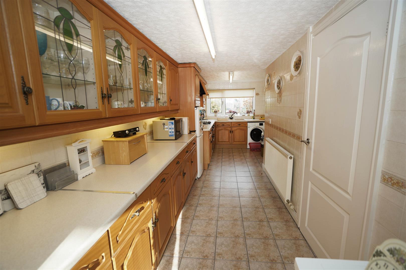 Fitted with a matching range of oak fronted base and eye level units with underlighting, drawers, cornice trims and contrasting round edged worktops, glazed display units, corner display shelf, 1+1/2 bowl composite sink unit with single drainer, mixer tap and tiled splashbacks, plumbing for washing machine, space for fridge/freezer, built-in electric fan assisted double oven, four ring gas hob with pull out extractor hood over, uPVC double glazed window to rear, uPVC double glazed window to side, radiator, ceramic tiled flooring, uPVC double glazed door to garden, open plan, door to: