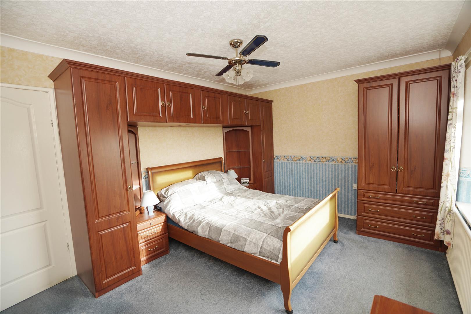 UPVC double glazed window to front, fitted bedroom suite with a range of wardrobes built-in double wardrobe(s) with hanging rails, shelving, overhead storage and cupboards, further two built-in single wardrobes, fitted matching dressing table, bedside cabinets and drawers, radiator, door to: