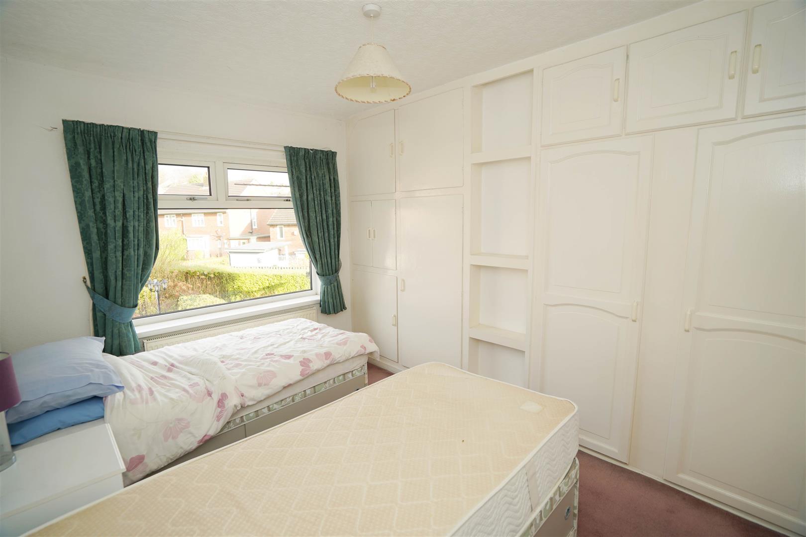 UPVC double glazed window to rear, fitted bedroom suite with a range of wardrobes comprising three built-in double wardrobes with hanging rail and shelving, radiator.